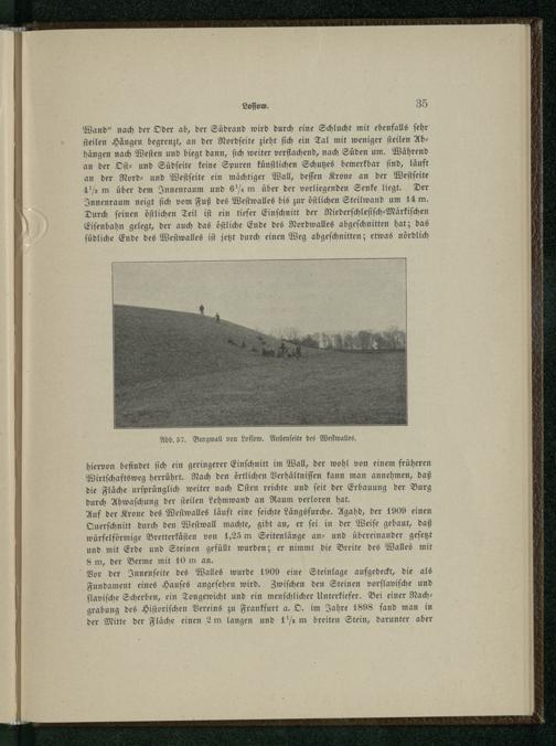 Wand“ nach der Oder ab, der Südrand wird durch eine Schlucht mit ebenfalls ſehr ſteilen Hängen begrenzt, an der Nordſeite zieht ſich ein Tal mit weniger ſteilen Abhängen nach Weſten und biegt dann, ſich weiter verflachend, nach Süden um. Während an der Oſt- und Südſeite keine Spuren künſtlichen Schutzes bemerkbar ſind, läuft an der Nord- und Weſtſeite ein mächtiger Wall, deſſen Krone an der Weſtſeite 416m über dem Innenraum und 6m über der vorliegenden Senke liegt. Der Innenraum neigt ſich vom Fuß des Weſtwalles bis zur öſtlichen Steilwand um 14m. Durch ſeinen öſtlichen Teil iſt ein tiefer Einſchnitt der Niederſchleſiſch⸗Märkiſchen Eiſenbahn gelegt, der auch das öſtliche Ende des Nordwalles abgeſchnitten hat; das ſüdliche Ende des Weſtwalles iſt jetzt durch einen Weg abgeſchnitten; etwas nördlich