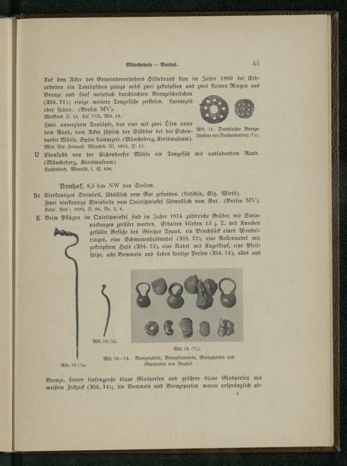 Auf dem Acker des Gemeindevorſtehers Hildebrand kam im Jahre 1889 bei Erd— arbeiten ein Tontöpfchen zutage nebſt zwei geknöpften und zwei kleinen Ringen aus Bronze und fünf mehrfach durchlochten Bronzeſcheibchen (Abb. 71); einige weitere Tongefäße zerfielen. Latenezeit oder ſpäter.(Berlin MV ).