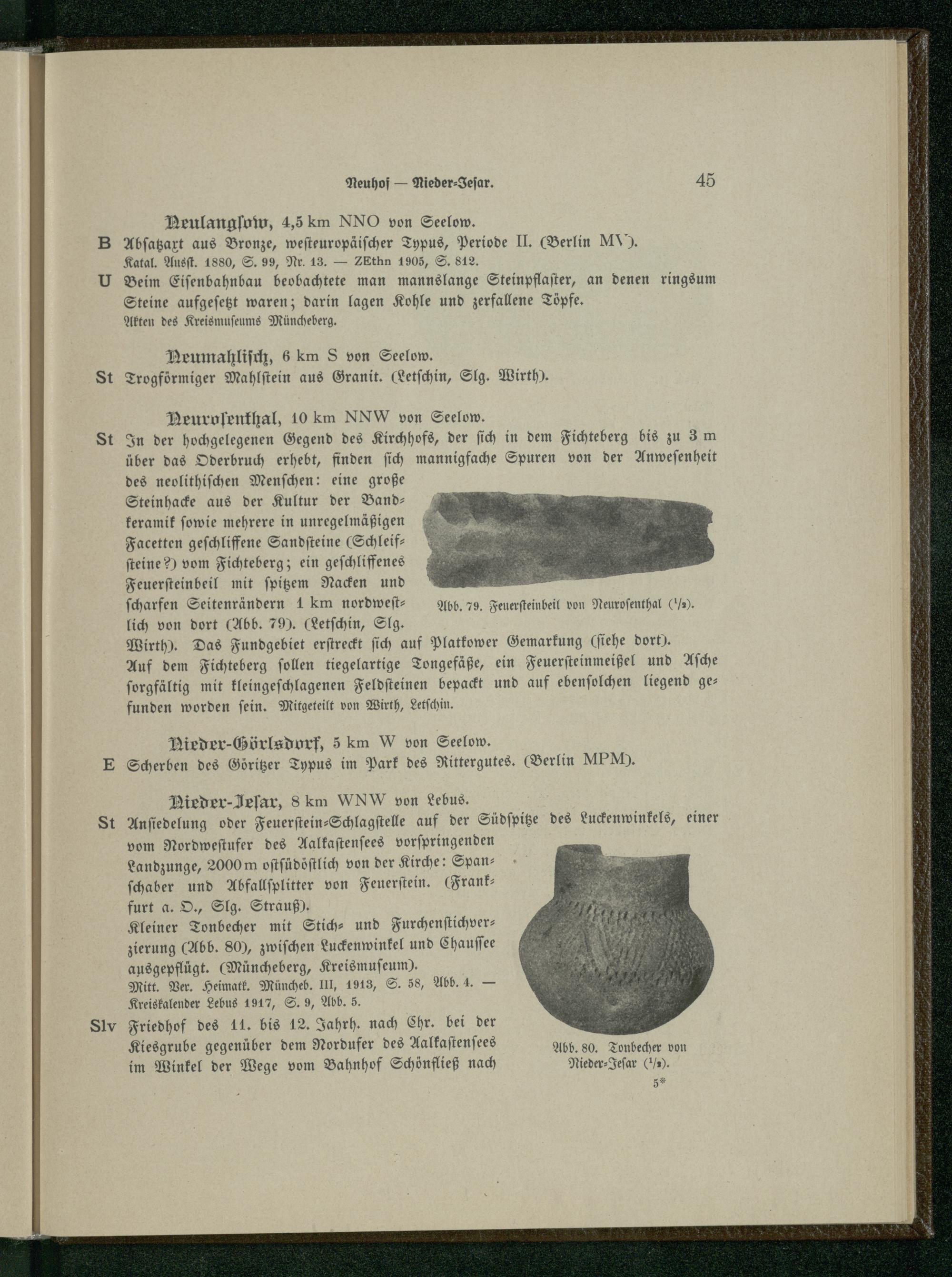 Nieder- Leſar, S km WNW von Lebus . Anſiedelung oder Feuerſtein-Schlagſtelle auf der Südſpitze des Luckenwinkels, einer vom Nordweſtufer des Aalkaſtenſees vorſpringenden Landzunge, 2000 m oſtſüdöſtlich von der Kirche: Spanſchaber und Abfallſplitter von Feuerſtein.(Frank furt a. O., Slg. Strauß). Kleiner Tonbecher mit Stich- und Furchenſtichver— zierung(Abb. 80), zwiſchen Luckenwinkel und Chauſſee U ausgepflügt.(Müncheberg , Kreismuſeum). 3 Mitt. Ver. Heimatk. Müncheb. Ill, 1913, S. 58, Abb. 4.— Kreiskalender Lebus 1917, S. 9, Abb. 5. Friedhof des 11. bis 12. Jahrh. nach Chr. bei der Kiesgrube gegenüber dem Nordufer des Aalkaſtenſees J im Winkel der Wege vom Bahnhof Schönfließ nach Nieder⸗Jeſar(1a).