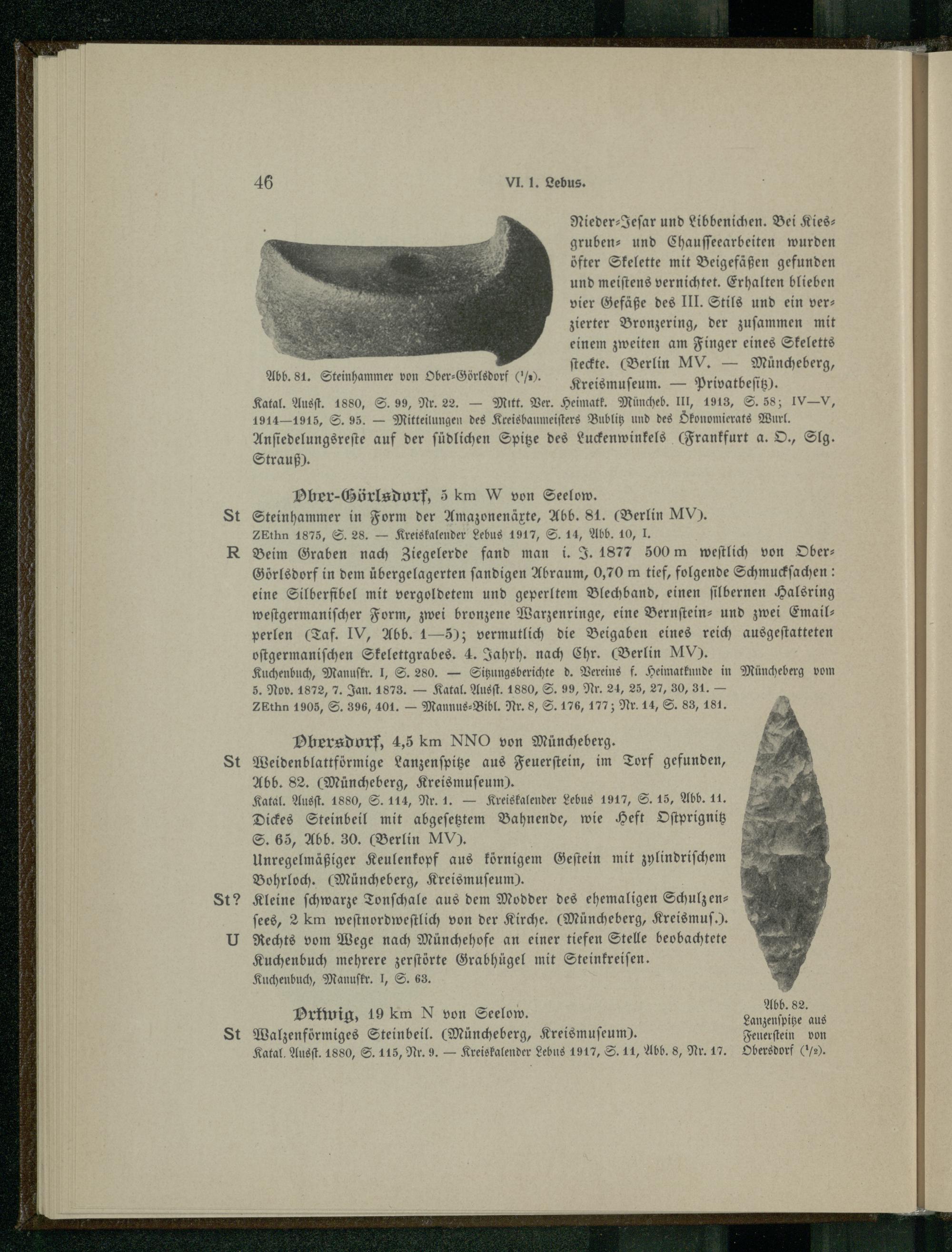 Katal. Ausſt. 1880, S. 114, Nr. 4.— Kreiskalender Lebus 1917, S. 15, Abb. 14. Dickes Steinbeil mit abgeſetztem Bahnende, wie Heft Oſtprignitz S. 65, Abb. 30.(Berlin MV).