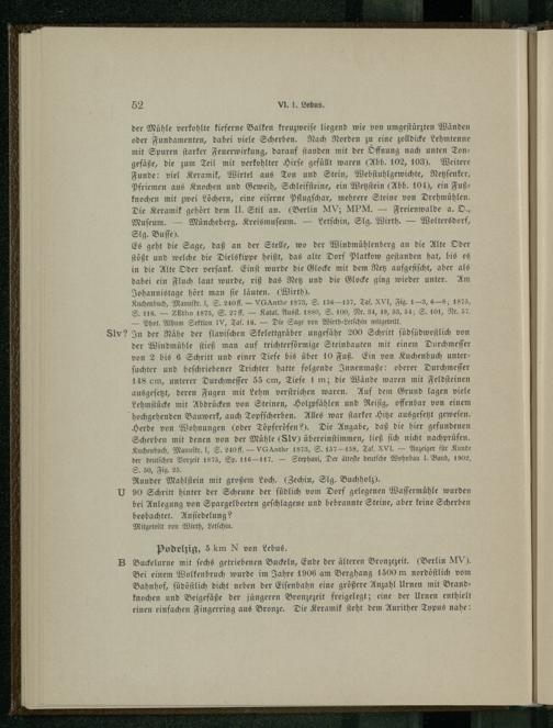 Podelzig , 5 km N von Lebus . Buckelurne mit ſechs getriebenen Buckeln, Ende der älteren Bronzezeit.(Berlin MV ). Bei einem Wolkenbruch wurde im Jahre 1906 am Berghang 1500 m nordöſtlich vom Bahnhof, ſüdöſtlich dicht neben der Eiſenbahn eine größere Anzahl Urnen mit Brandknochen und Beigefäße der jüngeren Bronzezeit freigelegt; eine der Urnen enthielt einen einfachen Fingerring aus Bronze. Die Keramik ſteht dem Aurither Typus nahe: