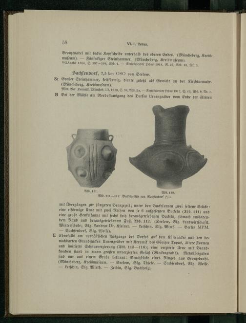 mit Übergängen zur jüngeren Bronzezeit; unter den Buckelurnen zwei ſeltene Stücke: eine eiförmige Urne mit zwei Reihen von je 6 aufgeſetzten Buckeln(Abb. 111) und eine große henkelkanne mit ſechs ſpitz herausgetriebenen Buckeln, ſchwach ausladen— dem Rand und herausgetriebenem Fuß, Abb. 112.(Seelow , Slg. Landwirtſchaftl. Winterſchule; Slg. Landrat Dr. Kleiner.— Letſchin, Slg. Wirth.— Berlin MPM. — Sachſendorf, Slg. Weiſe).