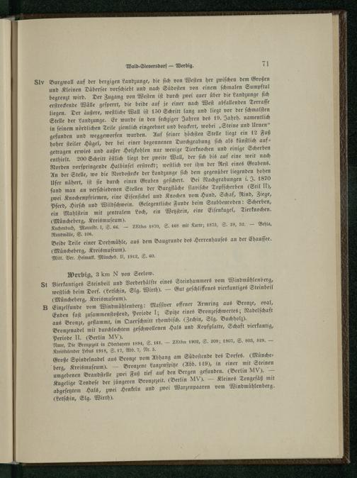 Werbig, 3 km N von Seelow . Vierkantiges Steinbeil und Vorderhälfte eines Steinhammers vom Windmühlenberg, weſtlich beim Dorf. (etſchin, Slg. Wirth).— Gut geſchliffenes vierkantiges Steinbeil (Müncheberg , Kreismuſeum). Einzelfunde vom Windmühlenberg: Maſſiver offener Armring aus Bronze, oval, Enden faſt zuſammenſtoßend, Periode I; Spitze eines Bronzeſchwertes; Nadelſchaft aus Bronze, geflammt, im Querſchnitt rhombiſch. Zechin , Slg. Buchholz). Bronzenadel mit durchlochtem geſchwollenen Hals und Kopfplatte, Schaft vierkantig, Periode II.(Berlin MV ).. Naue, Die Bronzezeit in Oberbayern 1894, S. 161.— ZEthn 1902, S. 209; 1907, S. 808, 829.— Kreiskalender Lebus 1918, S. 17, Abb. 7, Nr. 5. Große Spindelnadel aus Bronze vom Abhang am Südoſtende des Dorfes.(Münche berg , Kreismuſeum).— Bronzene Lanzenſpitze(Abb. 149), in einer mit Steinen umgebenen Brandſtelle zwei Fuß tief auf den Bergen gefunden.(Berlin MV).— Kugelige Tondoſe der jüngeren Bronzezeit.(Berlin MV).— Kleines Tongefäß mit abgeſetztem Hals, zwei Henkeln und zwei Warzenpaaren vom Windmühlenberg. (Letſchin , Slg. Wirth).