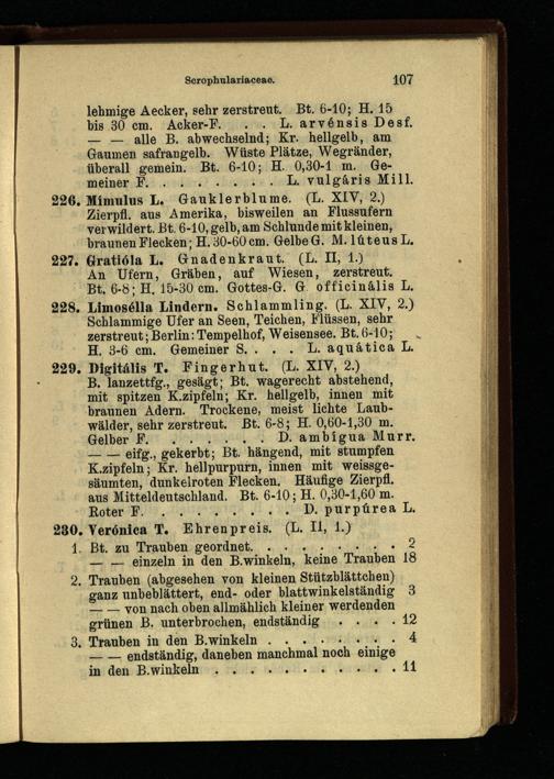 226. Mimulus L. Gauklerblume. (L. XIY, 2.) Zierpfl. aus Amerika, bisweilen an Flussufern verwildert. Bt. 6-10, gelb, am Schlunde mit kleinen, braunen Flecken; H. 30-60 cm. GelbeG. M.lüteusL.