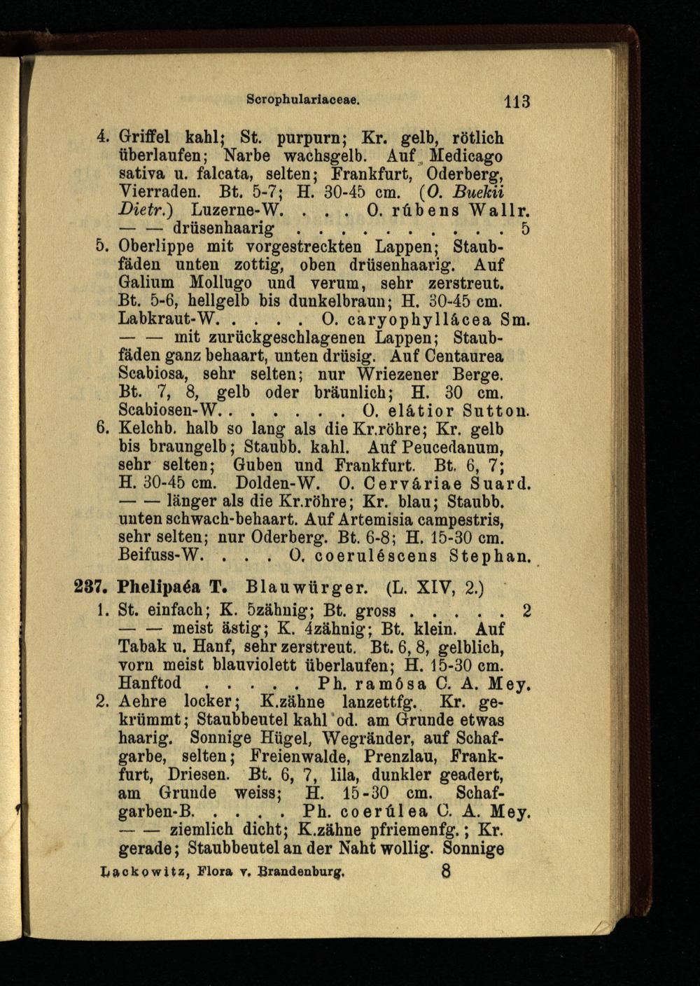 2. Aehre locker; K.zähne lanzettfg. Kr. gekrümmt; Staubbeutel kahl' od. am Grunde etwas haarig. Sonnige Hügel, Wegränder, auf Schafgarbe, selten; Freienwalde, Prenzlau, Frankfurt, Driesen. Bt. 6, 7, lila, dunkler geadert, am Grunde weiss; H. 15-30 cm. Schaf-