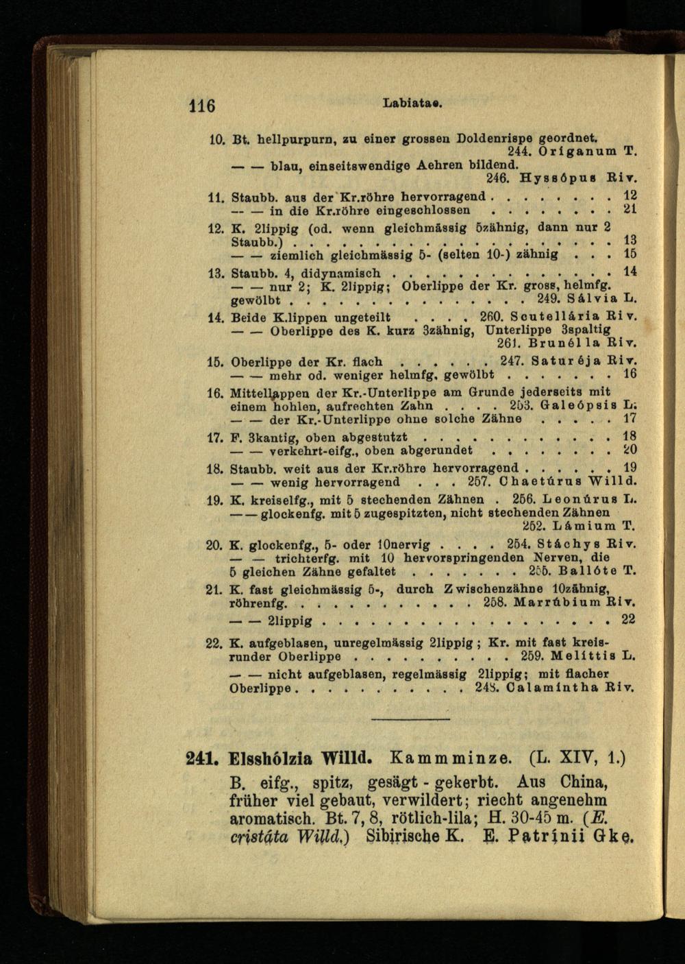 241. Eisshölzia Willd. Kammminze. (L. XIV, 1.) B. eifg., spitz, gesägt - gekerbt. Aus China, früher viel gebaut, verwildert; riecht angenehm aromatisch. Bt. 7, 8, rötlich-lila; J3. 30-45 m. (E. cristäta Willd,) Sibirische K. E. Patrinii Gke.