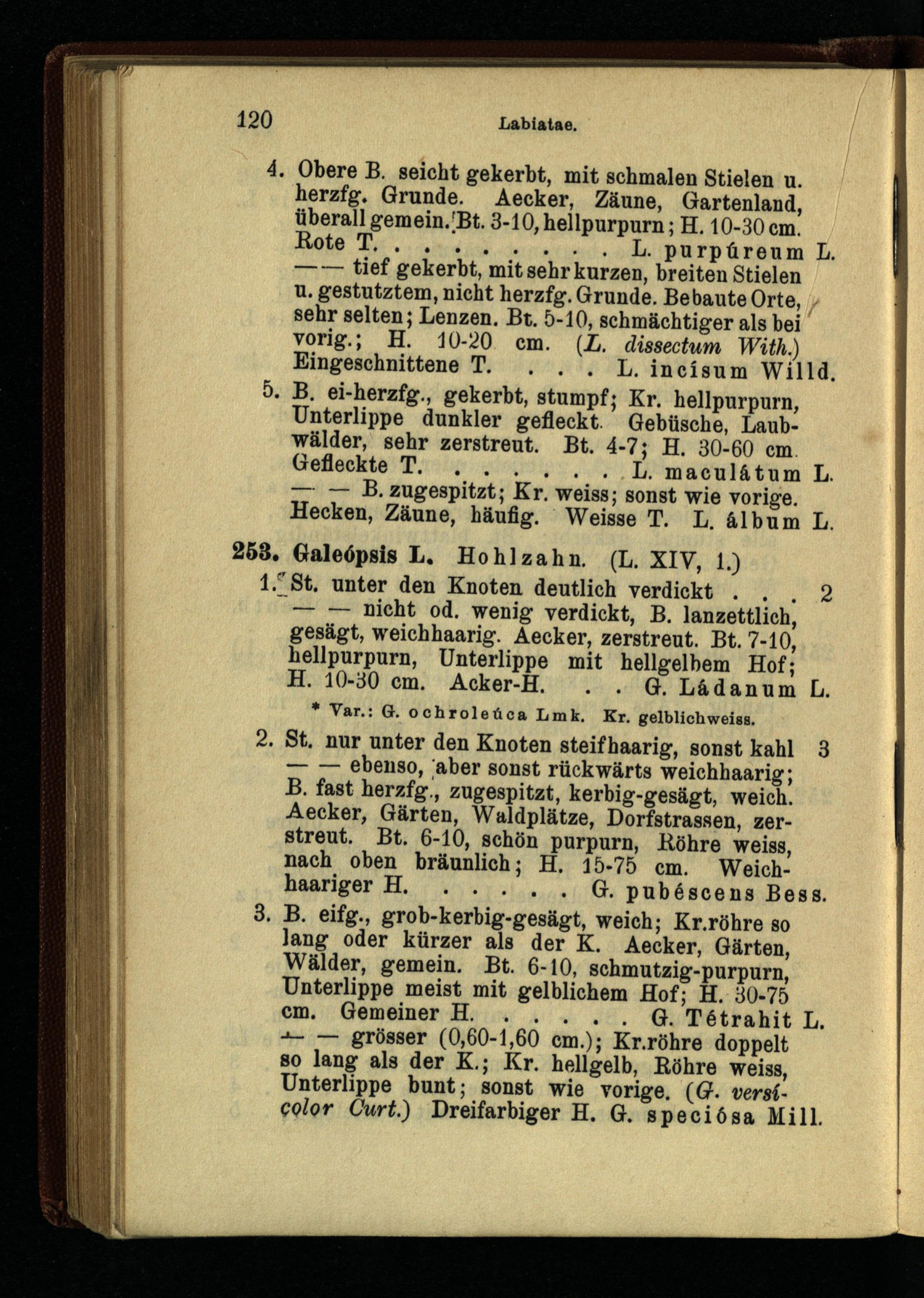 3. B. eifg., grob-kerbig-gesägt, weich; Kr.röhre so lang oder kürzer als der K. Aecker, Gärten, Wälder, gemein. Bt. 6-10, schmutzig-purpurn, Unterlippe meist mit gelblichem Hof; H. 30-75