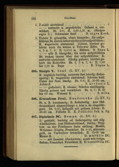 406. Erucästrum Presl. Hundsrauke. (L. XV, 2.) St. u. B. kurzhaarig; B. fiederteilig. Aus Süddeutschland eingeschleppt u. hier u. da eingebürgert. Bt. 6-10, hellgelb mit grünen Adern; H. 30-60 cm. Pollichs H. E. Pollichii Sch. u. Sp.