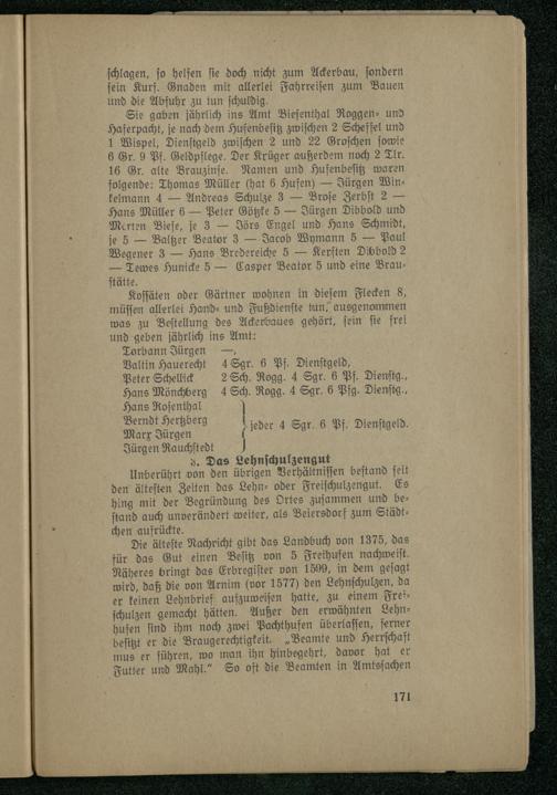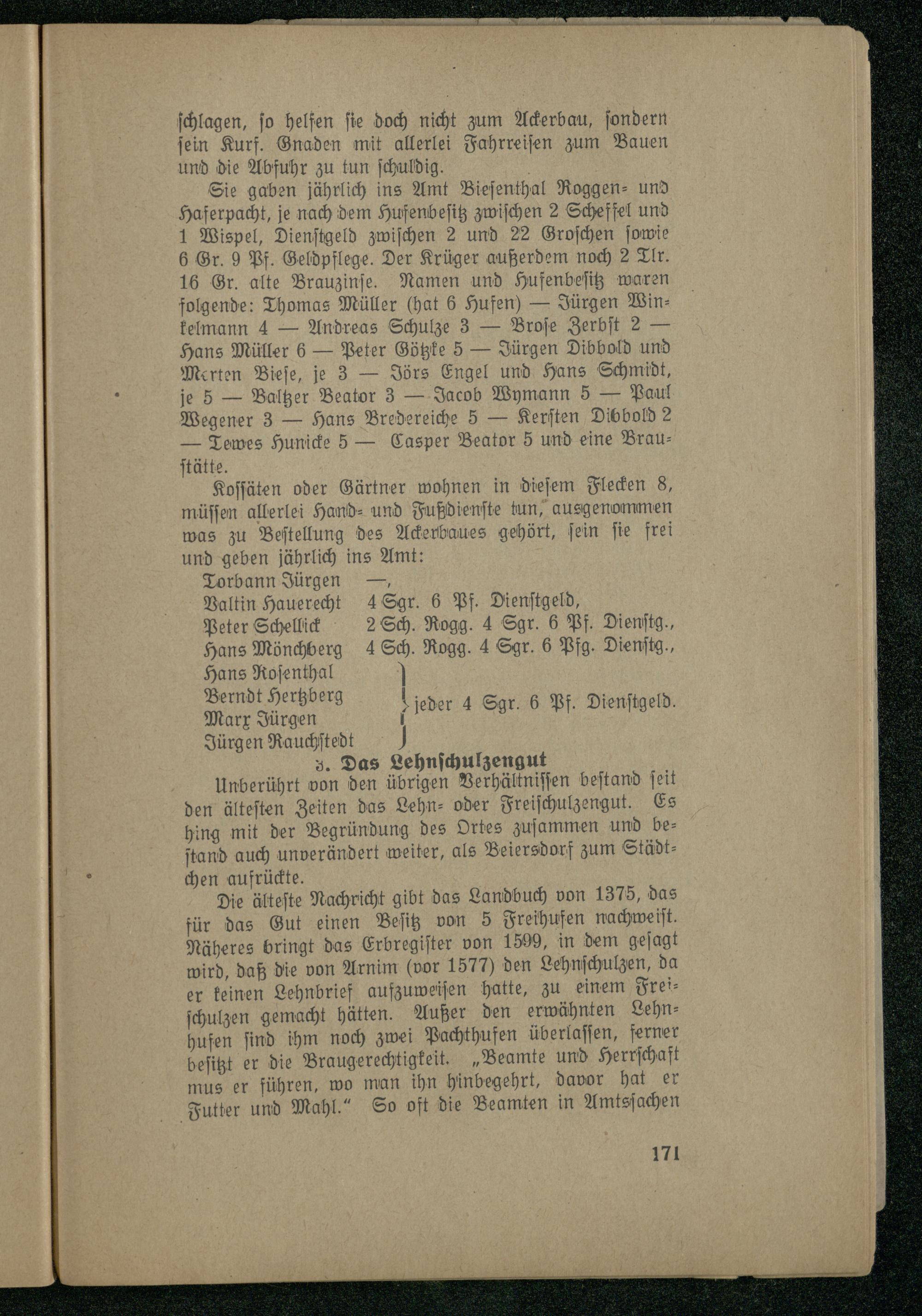 Die älteſte Nachricht gibt das Landbuch von 1375, das für das Gut einen Beſitz von 5 Freihufen nachweiſt. Näheres bringt das Erbregiſter von 1599, in dem geſagt wird, daß die von Arnim(vor 1577) den Lehnſchulzen, da er keinen Lehnbrief aufzuweiſen hatte, zu einem Freiſchulzen gemacht hätten. Außer den erwähnten Lehnhufen ſind ihm noch zwei Pachthufen überlaſſen, ferner beſitzt er die Braugerechtigkeit. Beamte und Herrſchaft mus er führen, wo man ihn hinbegehrt, davor hat er Futter und Mahl.“ So oft die Beamten in Amtsſachen