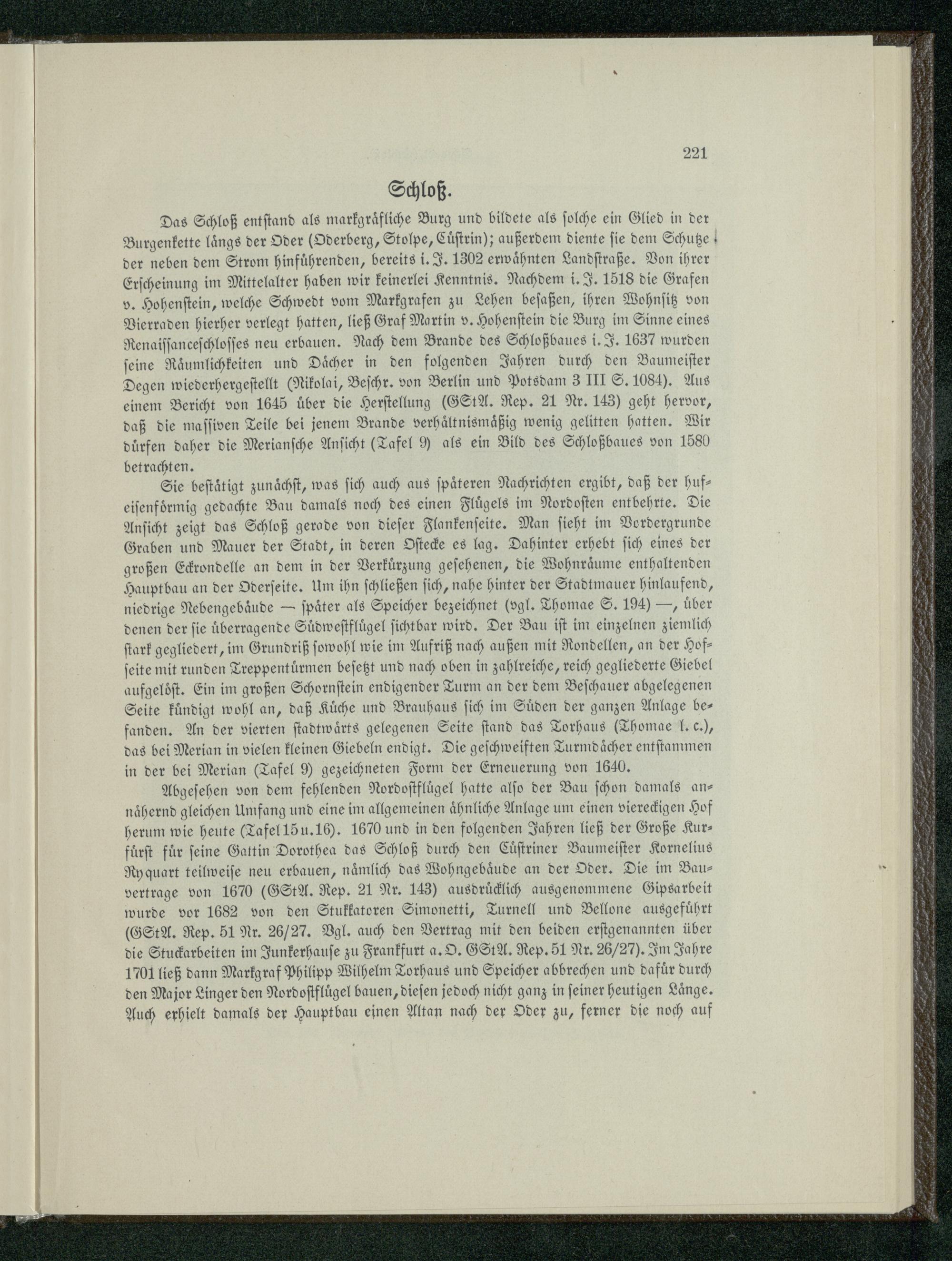 Das Schloß entſtand als markgraͤfliche Burg und bildete als ſolche ein Glied in der Burgenkette laͤngs der Oder(Oderberg , Stolpe, Cuͤſtrin); außerdem diente ſie dem Schutze! der neben dem Strom hinfuͤhrenden, bereits i. J. 1302 erwaͤhnten Landſtraße. Von ihrer Erſcheinung im Mittelalter haben wir keinerlei Kenntnis. Nachdem i. J. 1518 die Grafen v. Hohenſtein, welche Schwedt vom Markgrafen zu Lehen beſaßen, ihren Wohnſitz von Vierraden hierher verlegt hatten, ließ Graf Martin v. Hohenſtein die Burg im Sinne eines Renaiſſanceſchloſſes neu erbauen. Nach dem Brande des Schloßbaues i. J. 1637 wurden feine Raͤumlichkeiten und Dächer in den folgenden Jahren durch den Baumeiſter Degen wiederhergeſtellt(Nikolai, Beſchr. von Berlin und Potsdam 3 III S. 1084). Aus einem Bericht von 1645 über die Herſtellung(6StA. Rep. 21 Nr. 143) geht hervor, daß die maſſiven Teile bei jenem Brande verhältnismäßig wenig gelitten hatten. Wir dürfen daher die Merianſche Anſicht(Tafel 9 als ein Bild des Schloßbaues von 1580 betrachten.