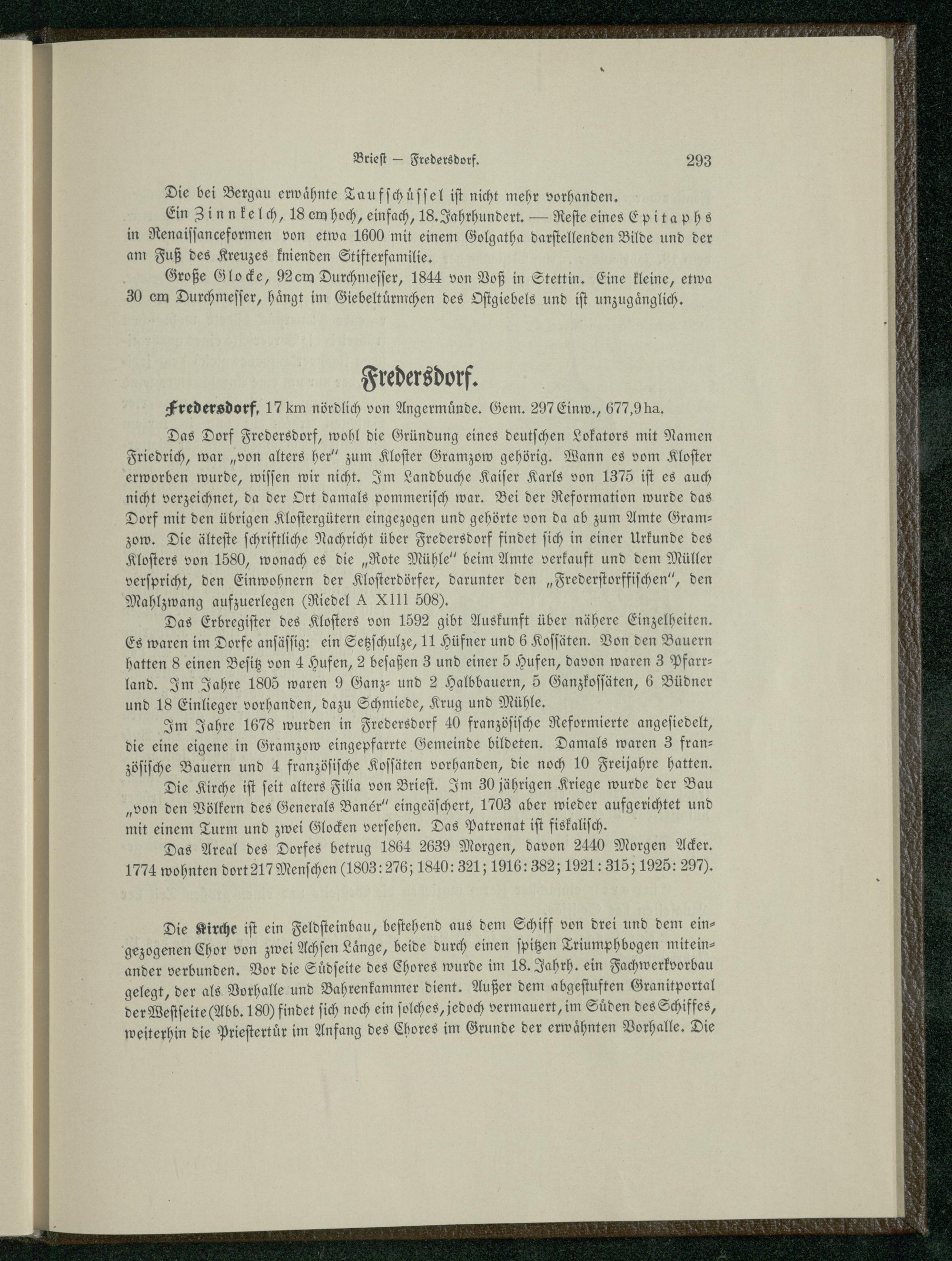 Im Jahre 1678 wurden in Fredersdorf 40 franzöſiſche Reformierte angeſiedelt, die eine eigene in Gramzow eingepfarrte Gemeinde bildeten. Damals waren 3 franzöſiſche Bauern und 4 franzöſiſche Koſſäten vorhanden, die noch 10 Freijahre hatten.