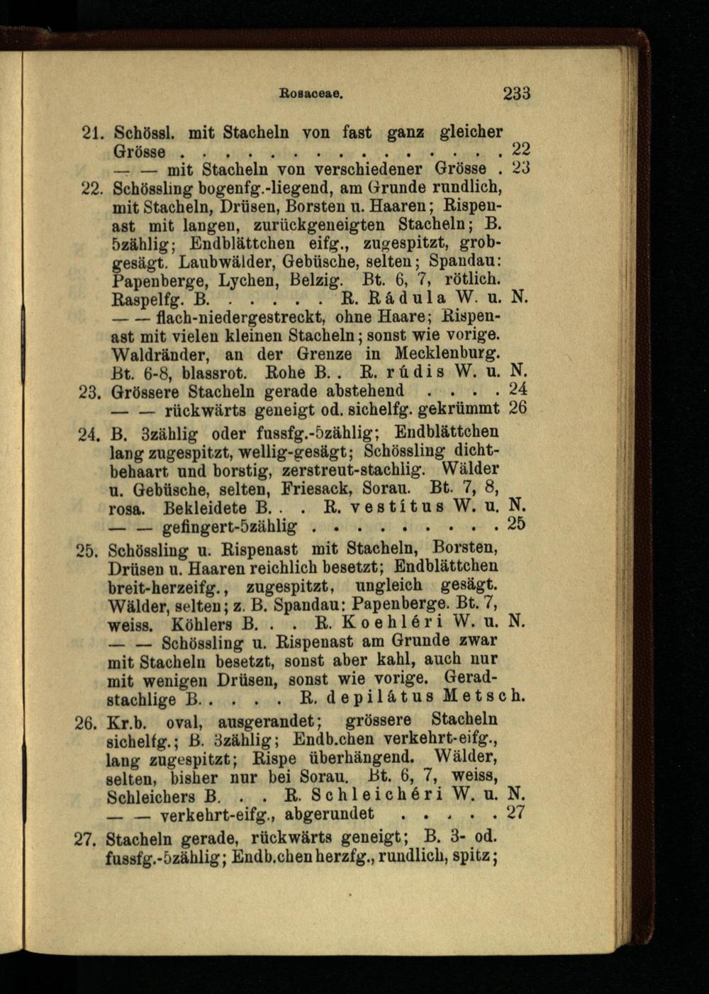 25. Schössling u. Rispenast mit Stacheln, Borsten, Drüsen u. Haaren reichlich besetzt; Endblättchen breit-herzeifg., zugespitzt, ungleich gesägt. Wälder, selten; z. B. Spandau: Papenberge. Bt. 7, weise. Köhlers B. . . R. Koehlöri W. u. N.