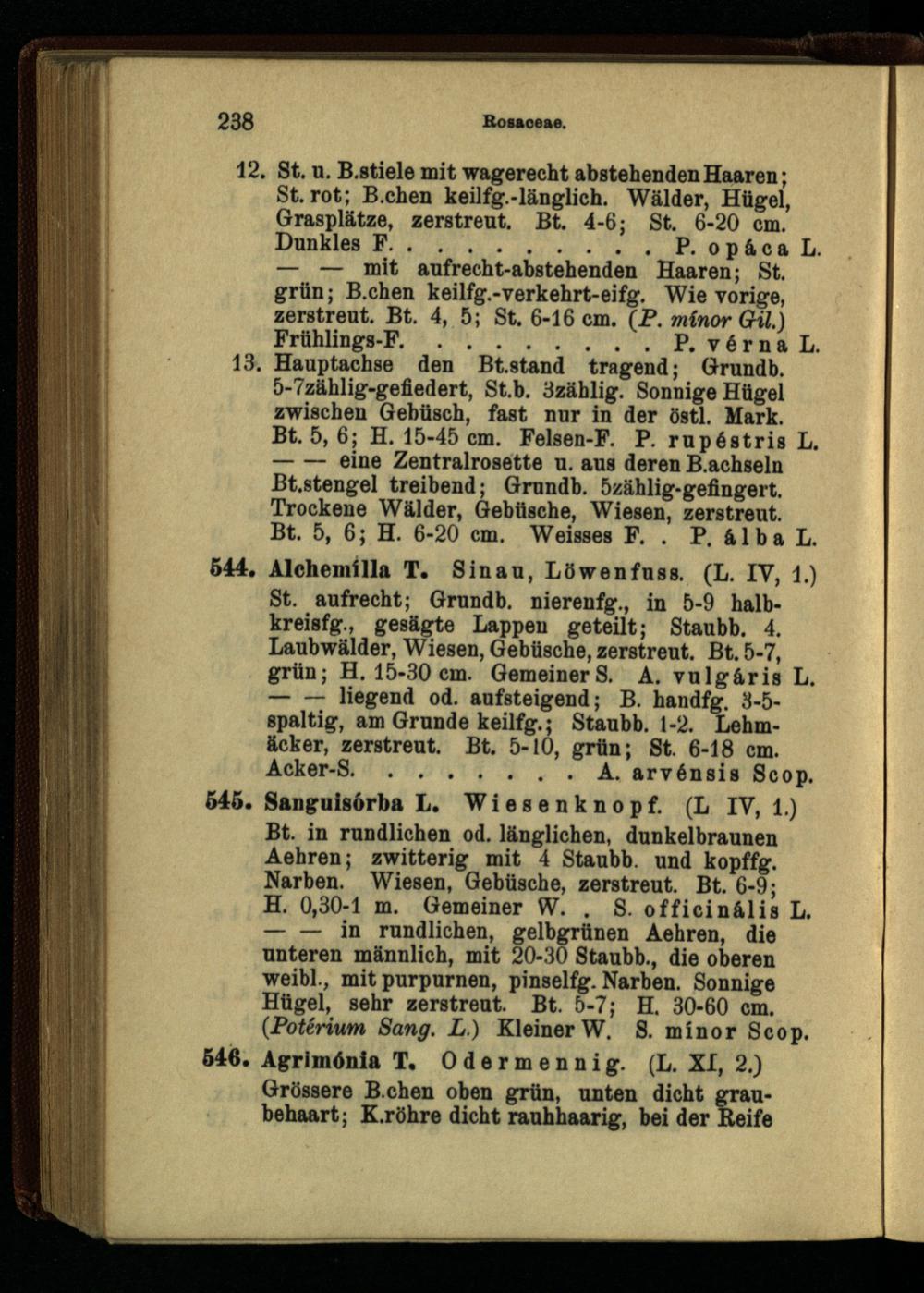 545. Sangulsdrba L. W i e s e n k n o p f. (L IV, 1.) Bt. in rundlichen od. länglichen, dunkelbraunen Aehren; zwitterig mit 4 Staubb. und kopffg. Narben. Wiesen, Gebüsche, zerstreut. Bt. 6-9;