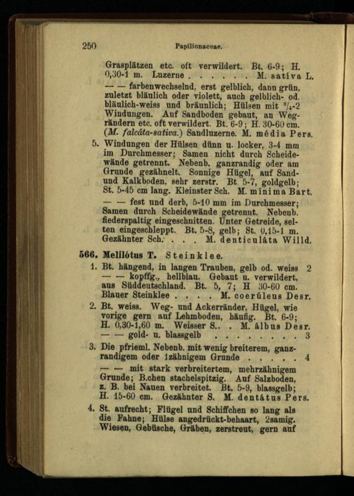 zuletzt bläulich oder violett, auch gelblich- od. bläulich-weiss und bräunlich; Hülsen mit */*-2 Windungen. Auf Sandboden gebaut, an Wegrändern etc. oft verwildert. Bt. 6-9; H. 30-60 cm. (M. falcäta-sativa.) Sandluzerne. M. mddia Pers.