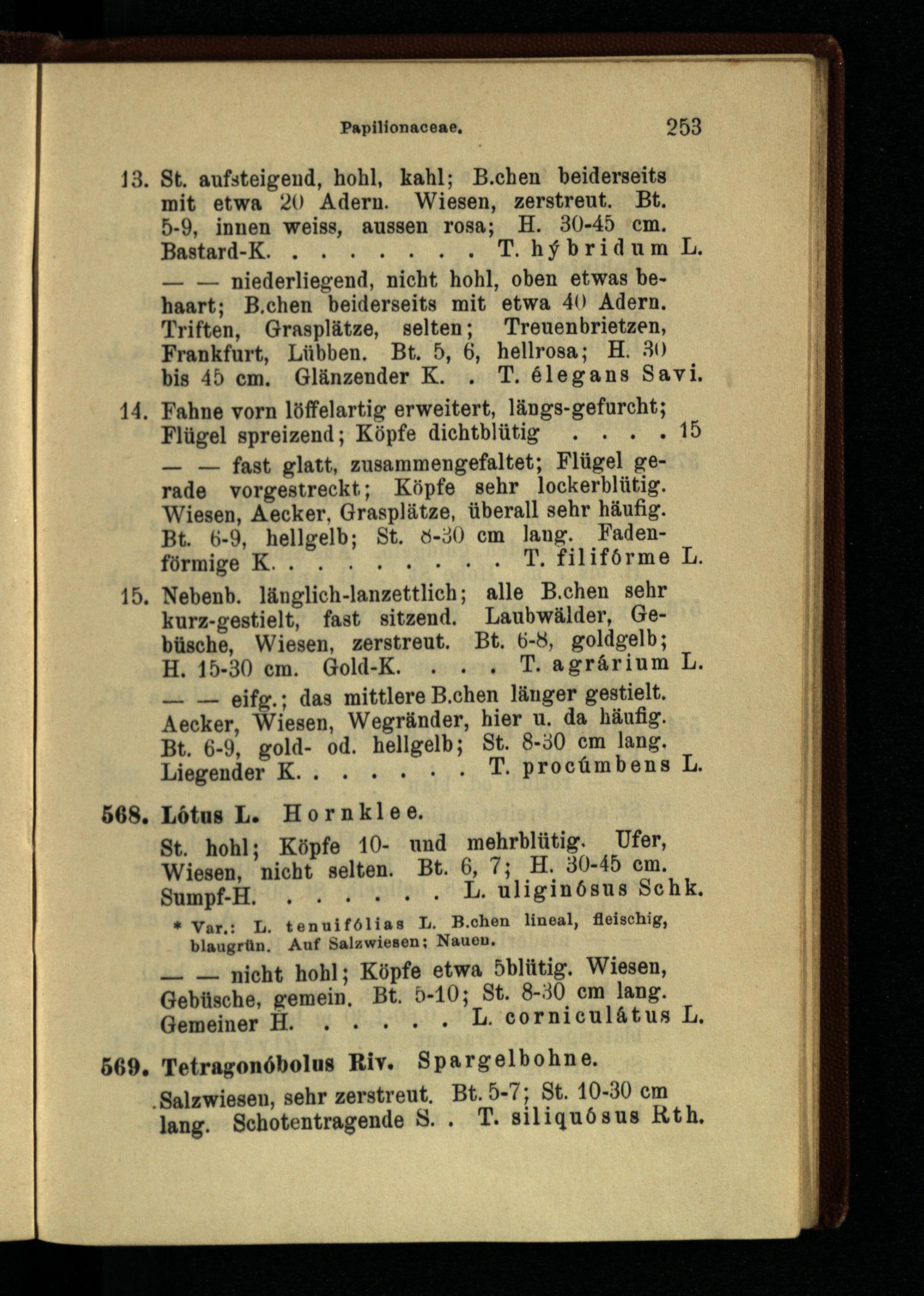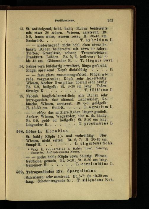 14. Fahne vorn löffelartig erweitert, längs-gefurcht; Flügel spreizend; Köpfe dichtblütig . . . .15 — — fast glatt, zusammengefaltet; Flügel gerade vorgestreckt; Köpfe sehr lockerblütig. Wiesen, Aecker, Grasplätze, überall sehr häufig.