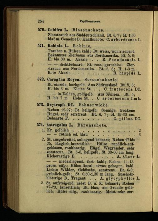 H. bis 30 m. Akazie . . R. Pseudacäcia L. -dichtbehaart; Bt. rosa, geruchlos. Zierstrauch aus Nordamerika. Bt. 5, 6; H. 1-3 m. Rote Akazie.R. hispida L.