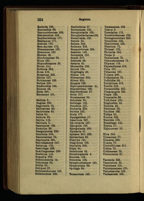 Salviuia 7. Sambuoua 129. Smnolua 90. Saogniaorba 238. Sanioala 216. Santalaoeae 73. Saponana 201. Sarutbamous 247. Hatnreja 118. Saxitraga 209. Saxifragaoeae 209. Scabioaa 133. Scaudix 2?0. Seheucbseria 14. Schoenua 26.