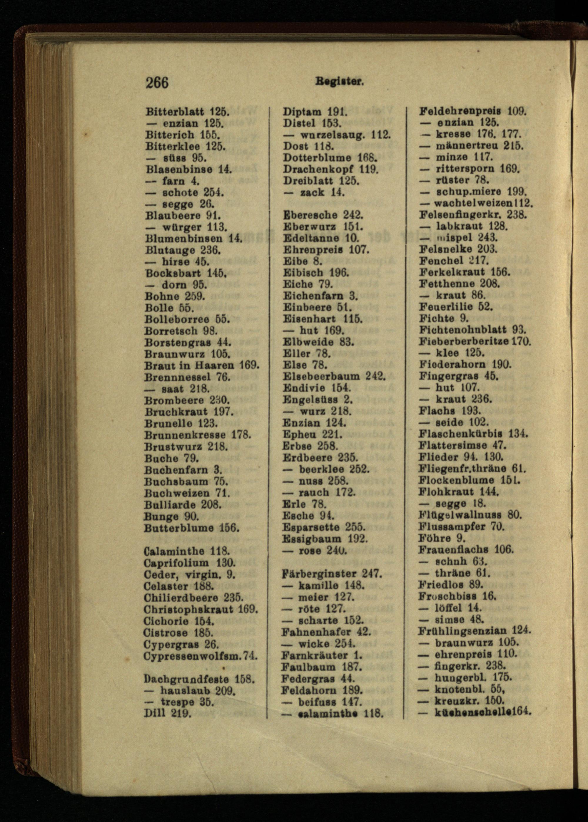 — saat 218. Brombeere 230. Bruchkraut 197. Brunelle 123. Brunnenkresse 178. Brustwurz 218. Buche 79. Bucbenfarn 3. Buchsbaum 75. Buohweisen 71. Bulliarde 208.