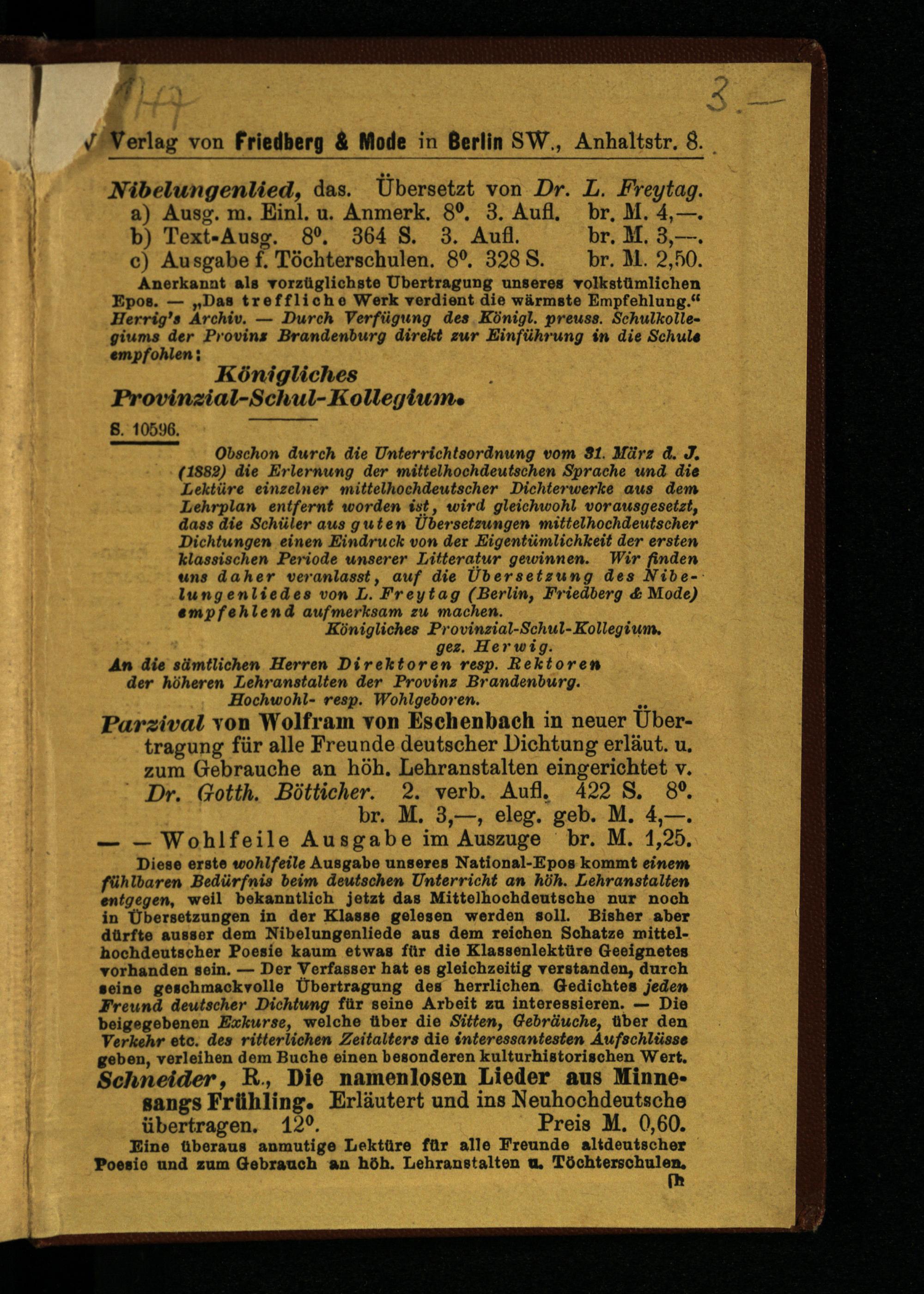 Obschon durch die Unterrichtsordnung vom Si. If ärz d. J, ( 1882 ) die Erlernung der mittelhochdeutschen Sprache und die Lektüre einzelner mittelhochdeutscher Dichterwerke aus dem Lehrplan entfernt worden ist, wird gleichwohl vorausgesetzt, dass die Schüler aus guten Übersetzungen mittelhochdeutscher Dichtungen einen Eindruck von de r Eigentümlichkeit der ersten klassischen Periode unserer Litteratur gewinnen. Wir finden uns daher veranlasst, auf die Übersetzung des Nibelungenliedes von L. Frey tag (Berlin, Friedberg <fc M ode) empfehlend aufmerksam zu machen.