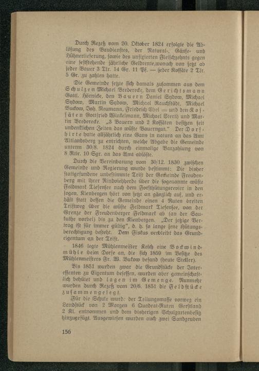 Bis 1851 wurden zwar die Grundſtücke der Inter— eſſenten zu Eigentum beſeſſen, wurden aber gemeinſchaftlich behütet und Lagen im Gemenge. Nunmehr wurden durch Rezeß vom 20/6. 1851 die Feld ſtücke zuſammengelegt.