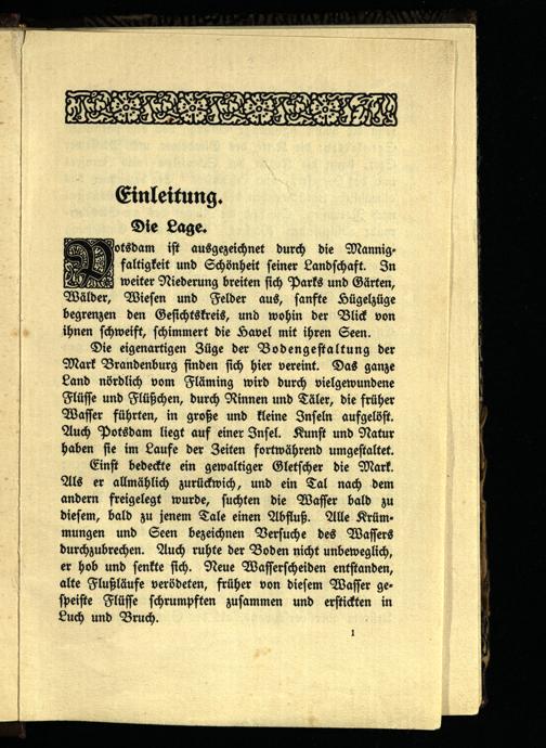 Potsdam ist ausgezeichnet durch die Mannigfaltigkeit und Schönheit seiner Landschaft. In weiter Niederung breiten sich Parks und Gärten, Wälder, Wiesen und Felder aus, sanfte Lügelzüge begrenzen den Gesichtskreis, und wohin der Blick von ihnen schweift, schimmert die Lavel mit ihren Seen.