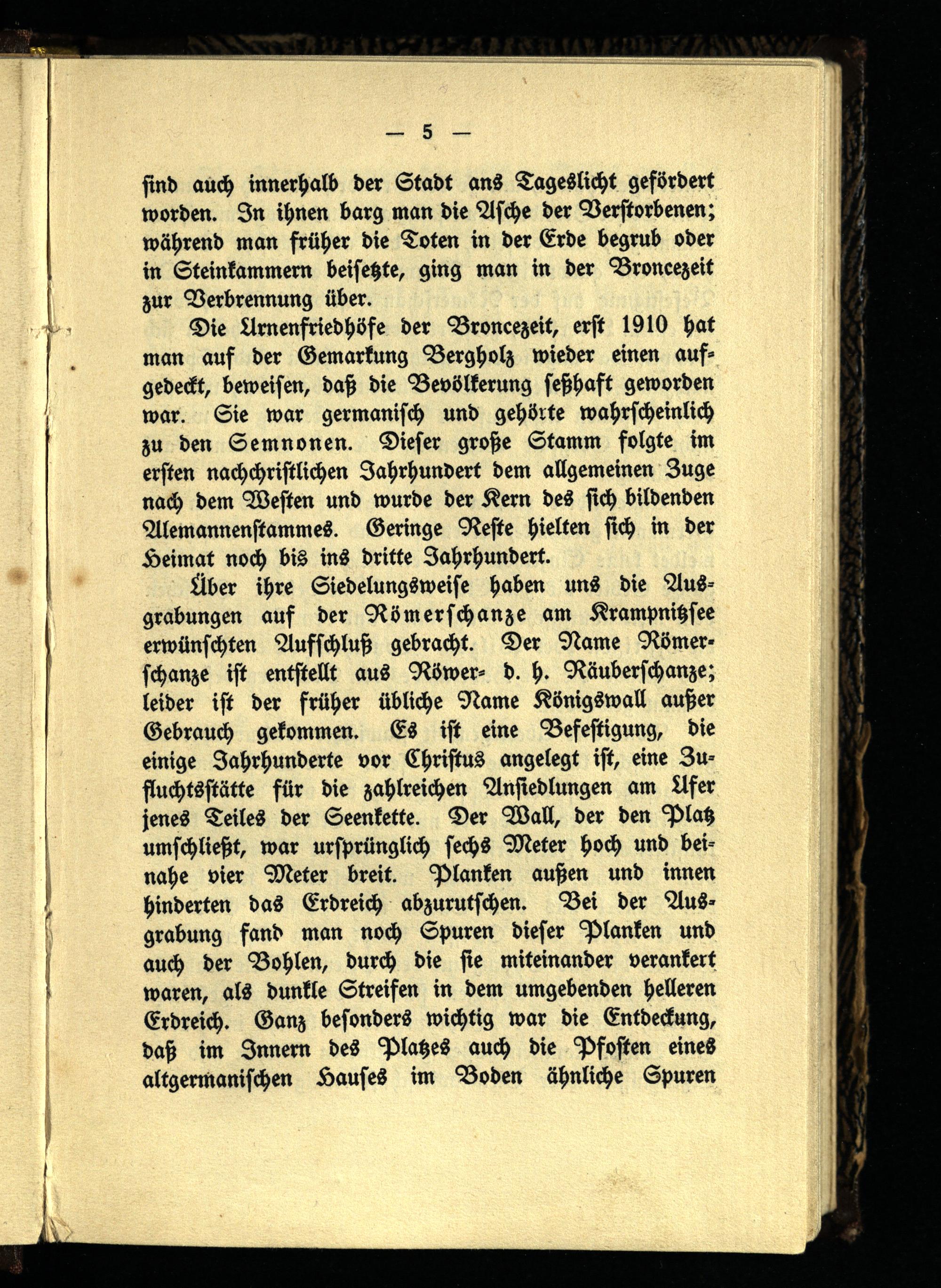 Die Urnenfriedhöfe der Broneezeit, erst 1910 hat man auf der Gemarkung Bergholz wieder einen aufgedeckt, beweisen, daß die Bevölkerung seßhaft geworden war. Sie war germanisch und gehörte wahrscheinlich zu den Semnonen. Dieser große Stamm folgte im ersten nachchristlichen Jahrhundert dem allgemeinen Zuge nach dem Westen und wurde der Kern des sich bildenden Alemannenstammes. Geringe Reste hielten sich in der Heimat noch bis ins dritte Jahrhundert.