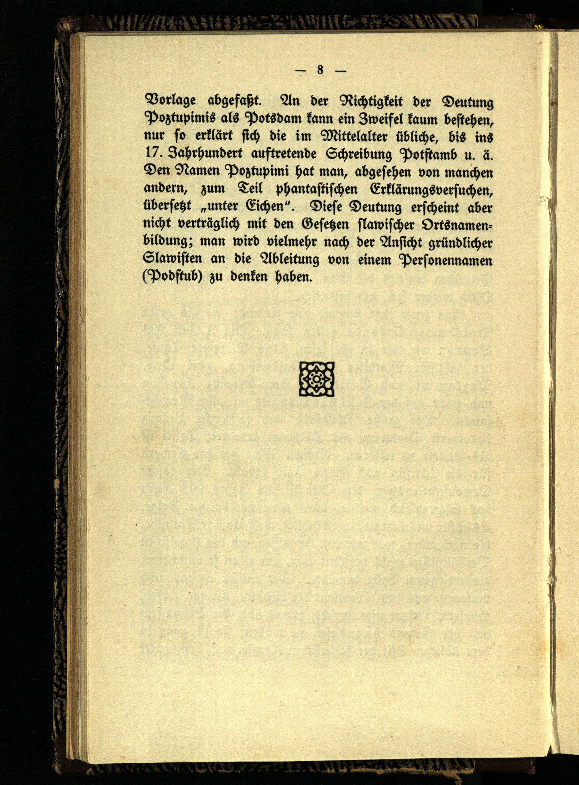 Vorlage abgefaßt. An der Richtigkeit der Deutung Poztupimis als Potsdam kann ein Zweifel kaum bestehen, nur so erklärt sich die im Mittelalter übliche, bis ins 17. Jahrhundert auftretende Schreibung Potstamb u. ä. Den Namen Poztupimi hat man, abgesehen von manchen andern, zum Teil phantastischen Erklärungsversuchen, übersetzt „unter Eichen". Diese Deutung erscheint aber nicht verträglich mit den Gesehen slawischer Ortsnamenbildung; man wird vielmehr nach der Ansicht gründlicher Slawisten an die Ableitung von einem Personennamen (Podstub) zu denken haben.