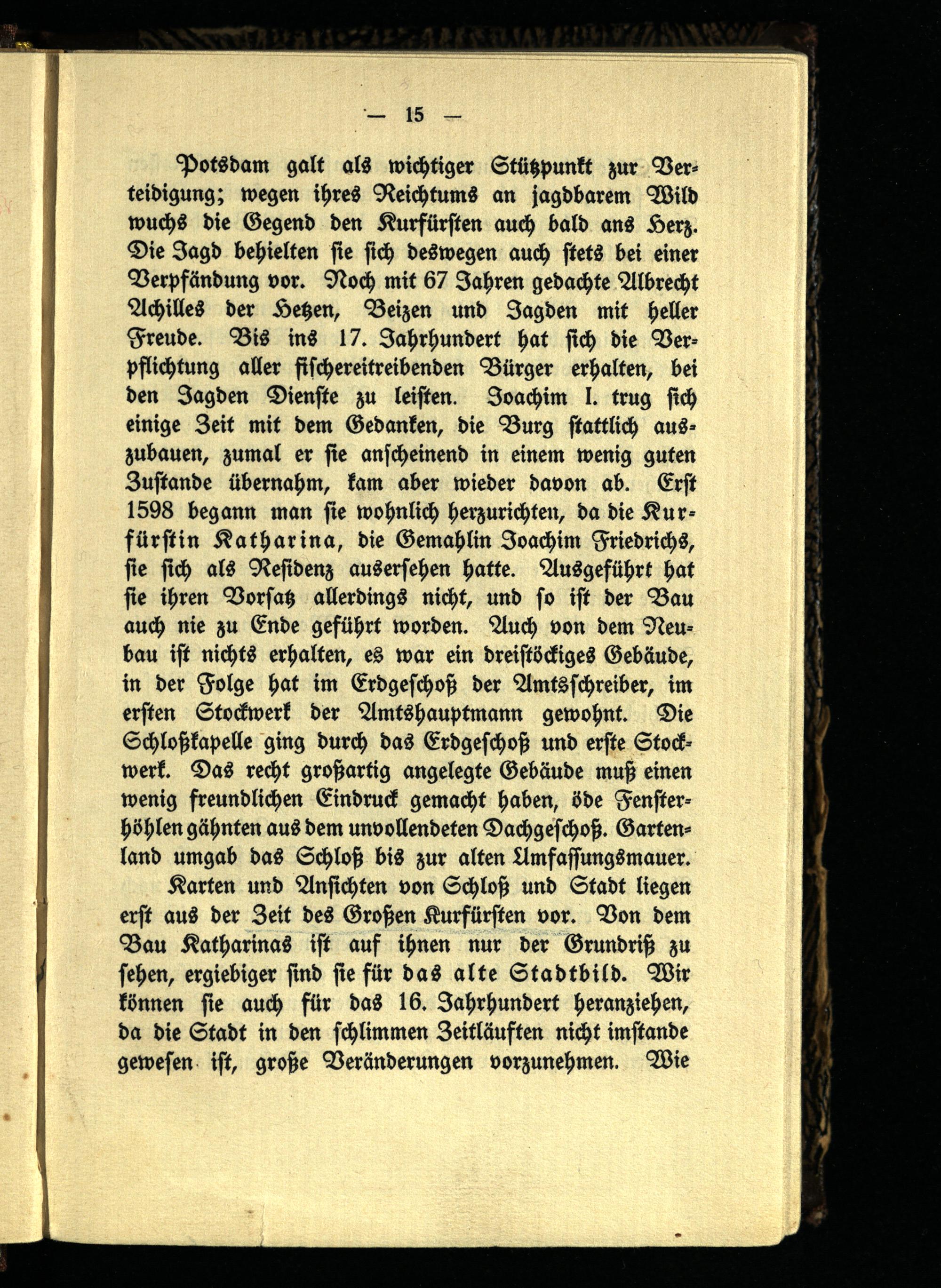 Potsdam galt als wichtiger Stützpunkt zur Verteidigung; wegen ihres Reichtums an jagdbarem Wild wuchs die Gegend den Kurfürsten auch bald ans Herz. Die Jagd behielten sie sich deswegen auch stets bei einer Verpfändung vor. Noch mit 67 Jahren gedachte Albrecht Achilles der Hetzen, Beizen und Jagden mit Heller Freude. Bis ins 17. Jahrhundert hat sich die Verpflichtung aller fischereitreibenden Bürger erhalten, bei den Jagden Dienste zu leisten. Joachim I. trug sich einige Zeit mit dem Gedanken, die Burg stattlich auszubauen, zumal er sie anscheinend in einem wenig guten Zustande übernahm, kam aber wieder davon ab. Erst 1598 begann man sie wohnlich herzurichten, da die Kurfürstin Katharina, die Gemahlin Joachim Friedrichs, sie sich als Residenz ausersehen hatte. Ausgeführt hat sie ihren Vorsatz allerdings nicht, und so ist der Bau auch nie zu Ende geführt worden. Auch von dem Neubau ist nichts erhalten, es war ein dreistöckiges Gebäude, in der Folge hat im Erdgeschoß der Amtsschreiber, im ersten Stockwerk der Amtshauptmann gewohnt. Die Schloßkapelle ging durch das Erdgeschoß und erste Stockwerk. Das recht großartig angelegte Gebäude muß einen wenig freundlichen Eindruck gemacht haben, öde Fensterhöhlen gähnten aus dem unvollendeten Dachgeschoß. Gartenland umgab das Schloß bis zur alten Umfassungsmauer.
