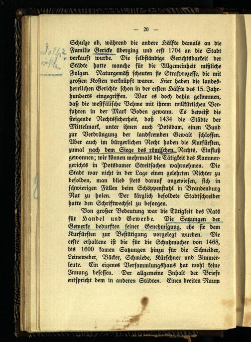 Schulze ab, während die andere Lälfte damals an die Familie Gericke überging und erst 1704 an die Stadt verkauft wurde. Die selbständige Gerichtsbarkeit der Städte hatte manche für die Allgemeinheit mißliche Folgen. Naturgemäß scheuten sie Strafprozesse, die mit großen Kosten verknüpft waren. Hier haben die landesherrlichen Gerichte schon in der ersten Hälfte des 15. Jahrhunderts eingegriffen. War es doch dahin gekommen, daß die westfälische Behme mit ihrem willkürlichen Verfahren in der Mark Boden gewann. Es beweist die steigende Rechtssicherheit, daß 1434 die Städte der Mittelmark, unter ihnen auch Potsdam, einen Bund zur Verdrängung der landfremden Gewalt schlossen. Aber auch im bürgerlichen Recht haben die Kurfürsten, zumal Mch^Wn^ZegL^M^tzwW^Rechts, Einfluß gewonnen; wir können mehrmals die Tätigkeit des Kammergerichts in Potsdamer Streitsachen wahrnehmen. Die Stadt war nicht in der Lage einen gelehrten Richter zu besolden, man blieb stets darauf angewiesen, sich in schwierigen Fällen beim Schöppenstuhl in Brandenburg Rat zu holen. Der kärglich besoldete Stadtschreiber hatte den Schriftwechsel zu besorgen.