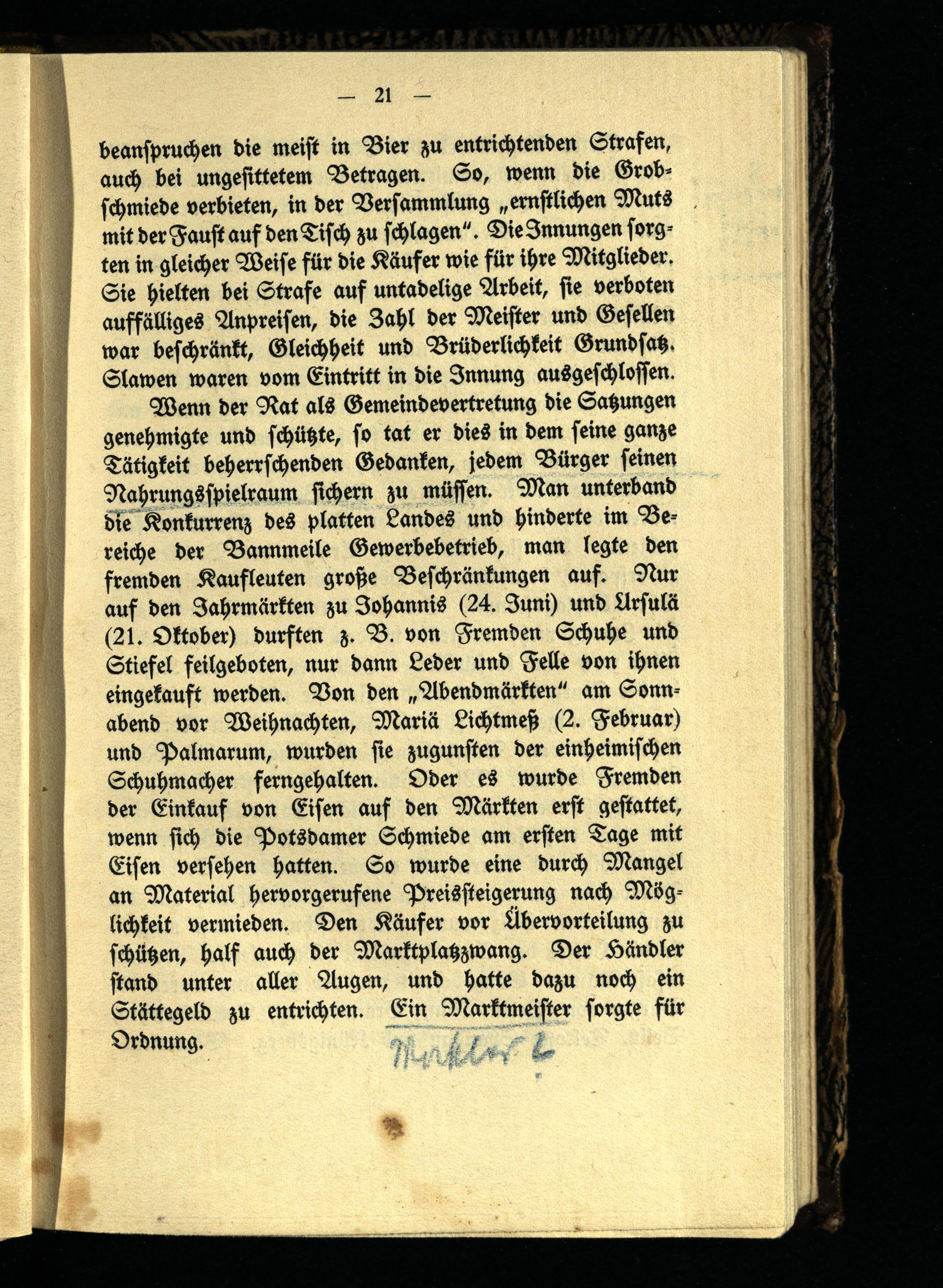 Wenn der Rat als Gemeindevertretung die Satzungen genehmigte und schützte, so tat er dies in dem seine ganze Tätigkeit beherrschenden Gedanken, jedem Bürger seinen Nahrungsspielraum sichern zu müssen. Man unterband die Konkurrenz des platten Landes und hinderte im Bereiche der Bannmeile Gewerbebetrieb, man legte den fremden Kaufleuten große Beschränkungen auf. Nur auf den Jahrmärkten zu Johannis (24. Juni) und Arsulä (21. Oktober) durften z. B. von Fremden Schuhe und Stiefel feilgeboten, nur dann Leder und Felle von ihnen eingekauft werden. Von den „Abendmärkten" am Sonnabend vor Weihnachten, Mariä Lichtmeß (2. Februar) und Palmarum, wurden sie zugunsten der einheimischen Schuhmacher ferngehalten. Oder es wurde Fremden der Einkauf von Eisen auf den Märkten erst gestattet, wenn sich die Potsdamer Schmiede am ersten Tage mit Eisen versehen hatten. So wurde eine durch Mangel an Material hervorgerufene Preissteigerung nach Möglichkeit vermieden. Den Käufer vor Übervorteilung zu schützen, half auch der Marktplatzzwang. Der Ländler stand unter aller Augen, und hatte dazu noch ein Stättegeld zu entrichten. Ein Marktmeister sorgte für Ordnung.