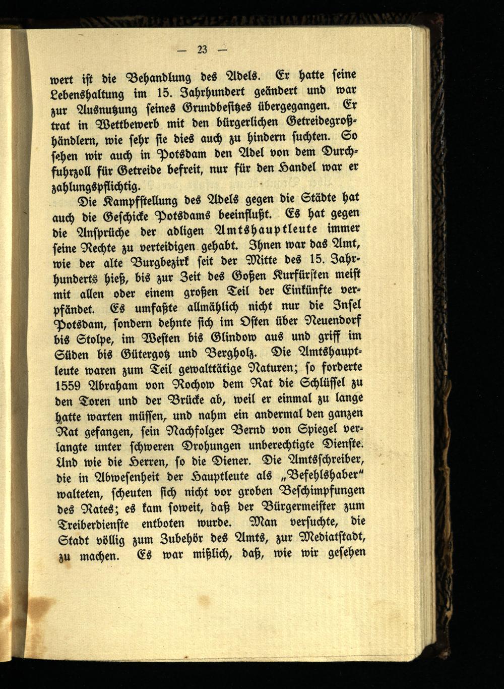 Die Kampfstellung des Adels gegen die Städte hat auch die Geschicke Potsdams beeinflußt. Es hat gegen die Ansprüche der adligen Amtshauptleute immer seine Rechte zu verteidigen gehabt. Ihnen war das Amt, wie der alte Burgbezirk seit der Mitte des 15. Jahrhunderts hieß, bis zur Zeit des Goßen Kurfürsten meist mit allen oder einem großen Teil der Einkünfte verpfändet. Es umfaßte allmählich nicht nur die Insel Potsdam, sondern dehnte sich im Osten über Neuendorf bis Stolpe, im Westen bis Glindow aus und griff im Süden bis Gütergotz und Bergholz. Die Amtshauptleute waren zum Teil gewalttätige Naturen; so forderte 1559 Abraham von Rochow dem Rat die Schlüssel zu den Toren und der Brücke ab, weil er einmal zu lange hatte warten müssen, und nahm ein andermal den ganzen Rat gefangen, sein Nachfolger Bernd von Spiegel verlangte unter schweren Drohungen unberechtigte Dienste. Und wie die Herren, so die Diener. Die Amtsschreiber, die in Abwesenheit der Hauptleute als „Befehlshaber" walteten, scheuten sich nicht vor groben Beschimpfungen des Rates; es kam soweit, daß der Bürgermeister zum Treiberdienste entboten wurde. Man versuchte, die Stadt völlig zum Zubehör des Amts, zur Mediatstadt, zu machen. Es war mißlich, daß, wie wir gesehen