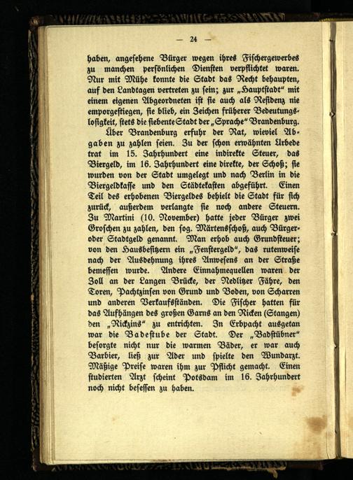 Über Brandenburg erfuhr der Rat, wieviel Abgaben zu zahlen seien. Zu der schon erwähnten Urbede trat im 15. Jahrhundert eine indirekte Steuer, das Biergeld, im 16. Jahrhundert eine direkte, der Schoß; sie wurden von der Stadt umgelegt und nach Berlin in die Biergeldkasse und den Städtekasten abgeführt. Einen Teil des erhobenen Biergeldes behielt die Stadt für sich zurück, außerdem verlangte sie noch andere Steuern. Zu Martini (10. November) hatte jeder Bürger zwei Groschen zu zahlen, den sog. Märtensschoß, auch Bürgeroder Stadtgeld genannt. Man erhob auch Grundsteuer; von den Hausbesitzern ein „Fenstergeld", das rutenweise nach der Ausdehnung ihres Anwesens an der Straße bemessen wurde. Andere Einnahmequellen waren der Zoll an der Langen Brücke, der Nedlitzer Fähre, den Toren, Pachtzinsen von Grund und Boden, von Scharren und anderen Verkaufsständen. Die Fischer hatten für das Aufhängen des großen Garns an den Ricken (Stangen) den „Rickzins" zu entrichten. In Erbpacht ausgetan war die Badestube der Stadt. Der „Badstübner" besorgte nicht nur die warmen Bäder, er war auch Barbier, ließ zur Ader und spielte den Wundarzt. Mäßige Preise waren ihm zur Pflicht gemacht. Einen studierten Arzt scheint Potsdam im 16. Jahrhundert noch nicht besessen zu haben.