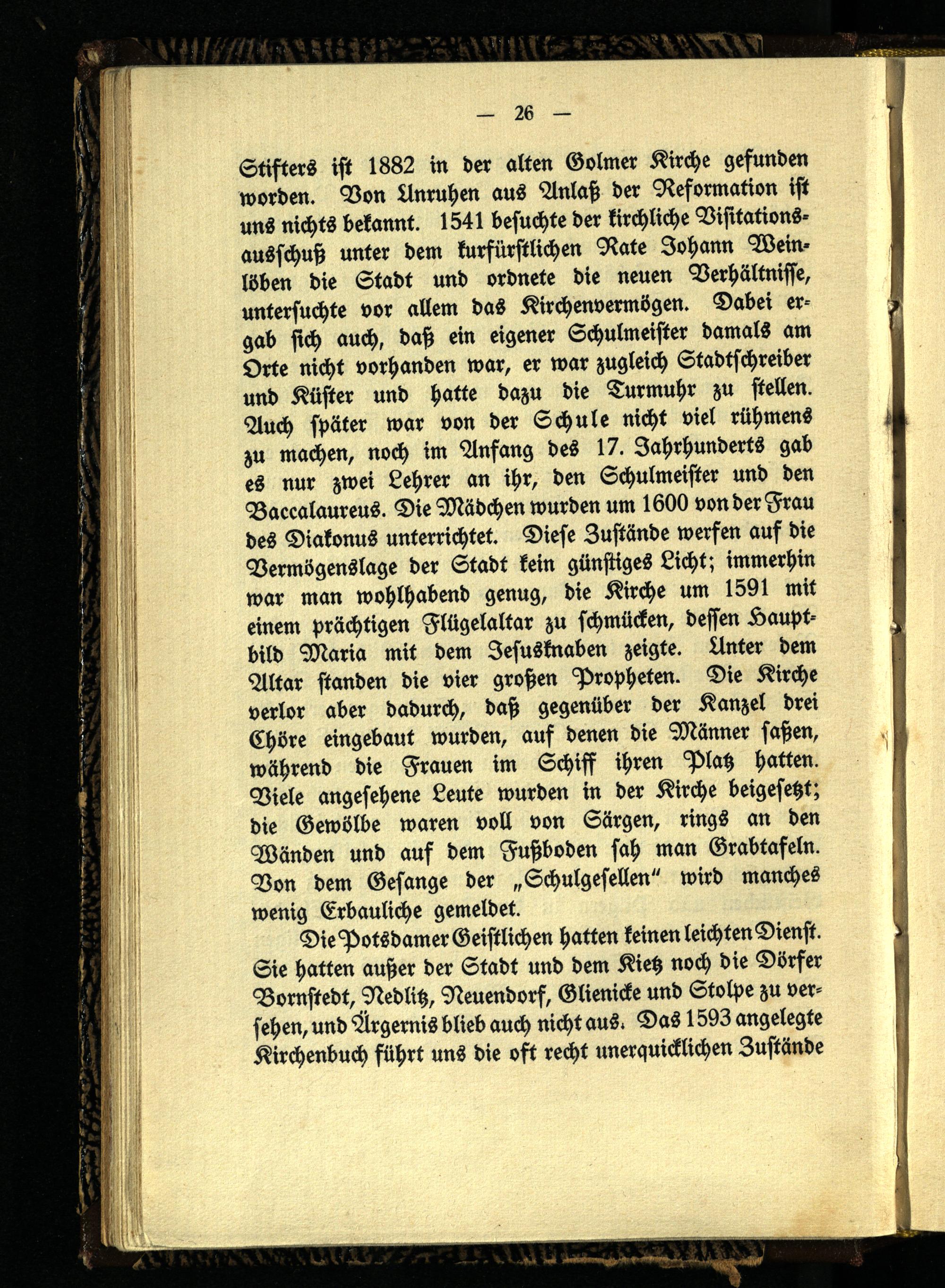 Stifters ist 1882 in der alten Golmer Kirche gefunden worden. Von Unruhen aus Anlaß der Reformation ist uns nichts bekannt. 1541 besuchte der kirchliche Visitationsausschuß unter dem kurfürstlichen Rate Johann Weinlöben die Stadt und ordnete die neuen Verhältnisse, untersuchte vor allem das Kirchenvermögen. Dabei ergab sich auch, daß ein eigener Schulmeister damals am Orte nicht vorhanden war, er war zugleich Stadtschreiber und Küster und hatte dazu die Turmuhr zu stellen. Auch später war von der Schule nicht viel rühmens zu machen, noch im Anfang des 17. Jahrhunderts gab es nur zwei Lehrer an ihr, den Schulmeister und den Baccalaureus. Die Mädchen wurden um 1600 von der Frau des Diakonus unterrichtet. Diese Zustände werfen auf die Vermögenslage der Stadt kein günstiges Licht; immerhin war man wohlhabend genug, die Kirche um 1591 mit einem prächtigen Flügelaltar zu schmücken, dessen Haupt- bild Maria mit dem Jesusknaben zeigte. Unter dem Altar standen die vier großen Propheten. Die Kirche verlor aber dadurch, daß gegenüber der Kanzel drei Chöre eingebaut wurden, auf denen die Männer saßen, während die Frauen im Schiff ihren Platz hatten. Viele angesehene Leute wurden in der Kirche beigesetzt; die Gewölbe waren voll von Särgen, rings an den Wänden und auf dem Fußboden sah man Grabtafeln. Von dem Gesänge der „Schulgesellen" wird manches wenig Erbauliche gemeldet.