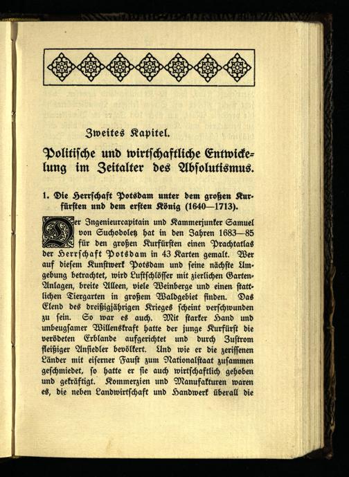 Ingenieurcapitain und Kammerjunker Samuel von Suchodoletz hat in den Jahren 1683—85 für den großen Kurfürsten einen Prachtatlas der Herrschaft Potsdam in 43 Karten gemalt. Wer auf diesem Kunstwerk Potsdam und seine nächste Umgebung betrachtet, wird Lustschlösser mit zierlichen Garten- Anlagen, breite Alleen, viele Weinberge und einen stattlichen Tiergarten in großem Waldgebiet finden. Das Elend des dreißigjährigen Krieges scheint verschwunden zu sein. So war es auch. Mit starker Hand und unbeugsamer Willenskraft hatte der junge Kurfürst die verödeten Erblande aufgerichtet und durch Zustrom fleißiger Ansiedler bevölkert. And wie er die zerissenen Länder mit eiserner Faust zum Nationalstaat zusammen geschmiedet, so hatte er sie auch wirtschaftlich gehoben und gekräftigt. Kommerzien und Manufakturen waren es, die neben Landwirtschaft und Handwerk überall die