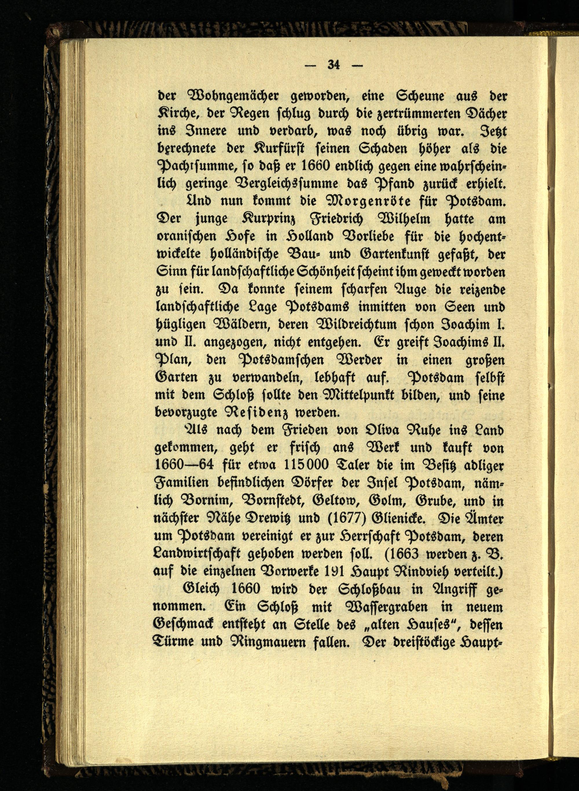 Und nun kommt die Morgenröte für Potsdam. Der junge Kurprinz Friedrich Wilhelm hatte am oranischen Lose in Holland Vorliebe für die hochentwickelte holländische Bau- und Gartenkunst gefaßt, der Sinn für landschaftliche Schönheit scheint ihm geweckt worden zu sein. Da konnte seinem scharfen Auge die reizende landschaftliche Lage Potsdams inmitten von Seen und hügligen Wäldern, deren Wildreichtum schon Joachim I. und II. angezogen, nicht entgehen. Er greift Joachims II. Plan, den Potsdamschen Werder in einen großen Garten zu verwandeln, lebhaft auf. Potsdam selbst mit dem Schloß sollte den Mittelpunkt bilden, und seine bevorzugte Residenz werden.
