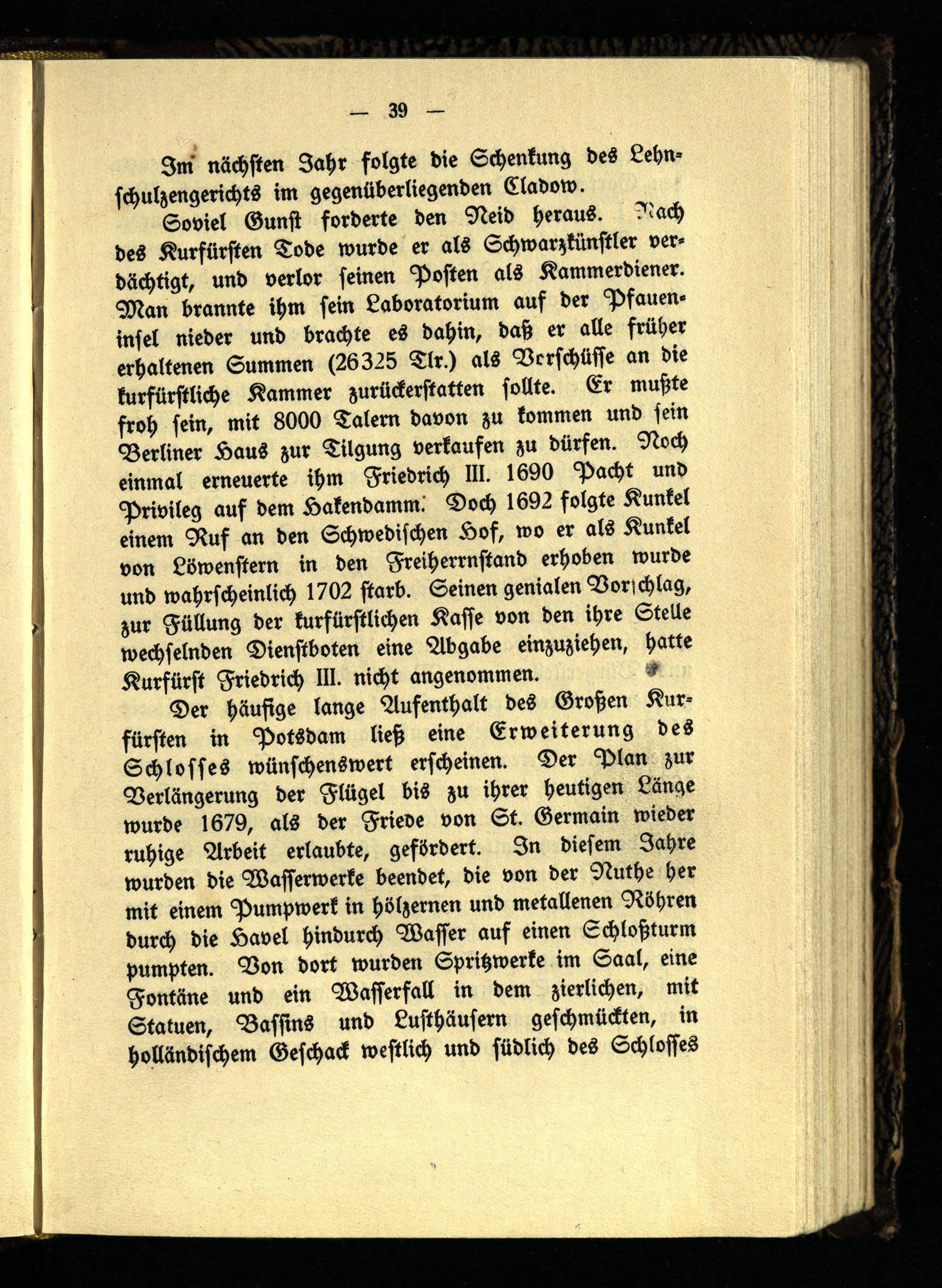 Soviel Gunst forderte den Neid heraus. Nach des Kurfürsten Tode wurde er als Schwarzkünstler ver- dächtigt, und verlor seinen Posten als Kammerdiener. Man brannte ihm sein Laboratorium auf der Pfaueninsel nieder und brachte es dahin, daß er alle früher erhaltenen Summen (26325 Tlr.) als Vorschüsse an die kurfürstliche Kammer zurückerstatten sollte. Er mußte froh sein, mit 8000 Talern davon zu kommen und sein Berliner Haus zur Tilgung verkaufen zu dürfen. Noch einmal erneuerte ihm Friedrich III. 1690 Pacht und Privileg auf dem Hakendamm. Doch 1692 folgte Kunkel einem Ruf an den Schwedischen Hof, wo er als Kunkel von Löwenstern in den Freiherrnstand erhoben wurde und wahrscheinlich 1702 starb. Seinen genialen Vorschlag, zur Füllung der kurfürstlichen Kasse von den ihre Stelle wechselnden Dienstboten eine Abgabe einzuziehen, hatte Kurfürst Friedrich III. nicht angenommen.