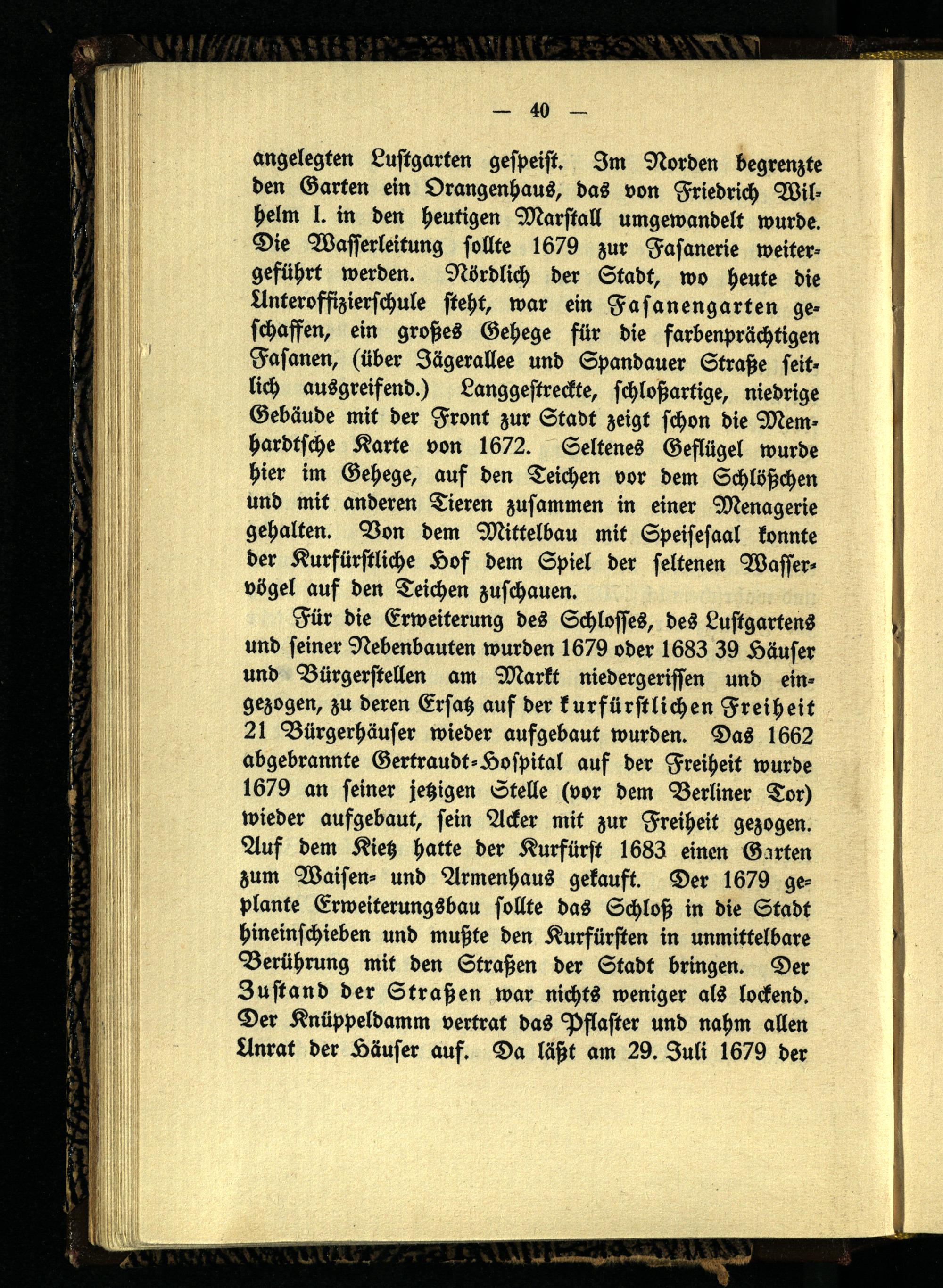 angelegten Lustgarten gespeist. Im Norden begrenzte den Garten ein Orangenhaus, das von Friedrich Wilhelm I. in den heutigen Marstall umgewandelt wurde. Die Wasserleitung sollte 1679 zur Fasanerie weitergeführt werden. Nördlich der Stadt, wo heute die Unteroffizierschule steht, war ein Fasanengarten ge- schaffen, ein großes Gehege für die farbenprächtigen Fasanen, (über Jägerallee und Spandauer Straße seitlich ausgreifend.) Langgestreckte, schloßartige, niedrige Gebäude mit der Front zur Stadt zeigt schon die Mem- hardtsche Karte von 1672. Seltenes Geflügel wurde hier im Gehege, auf den Teichen vor dem Schlößchen und mit anderen Tieren zusammen in einer Menagerie gehalten. Von dem Mittelbau mit Speisesaal konnte der Kurfürstliche Hof dem Spiel der seltenen Wasservögel auf den Teichen zuschauen.