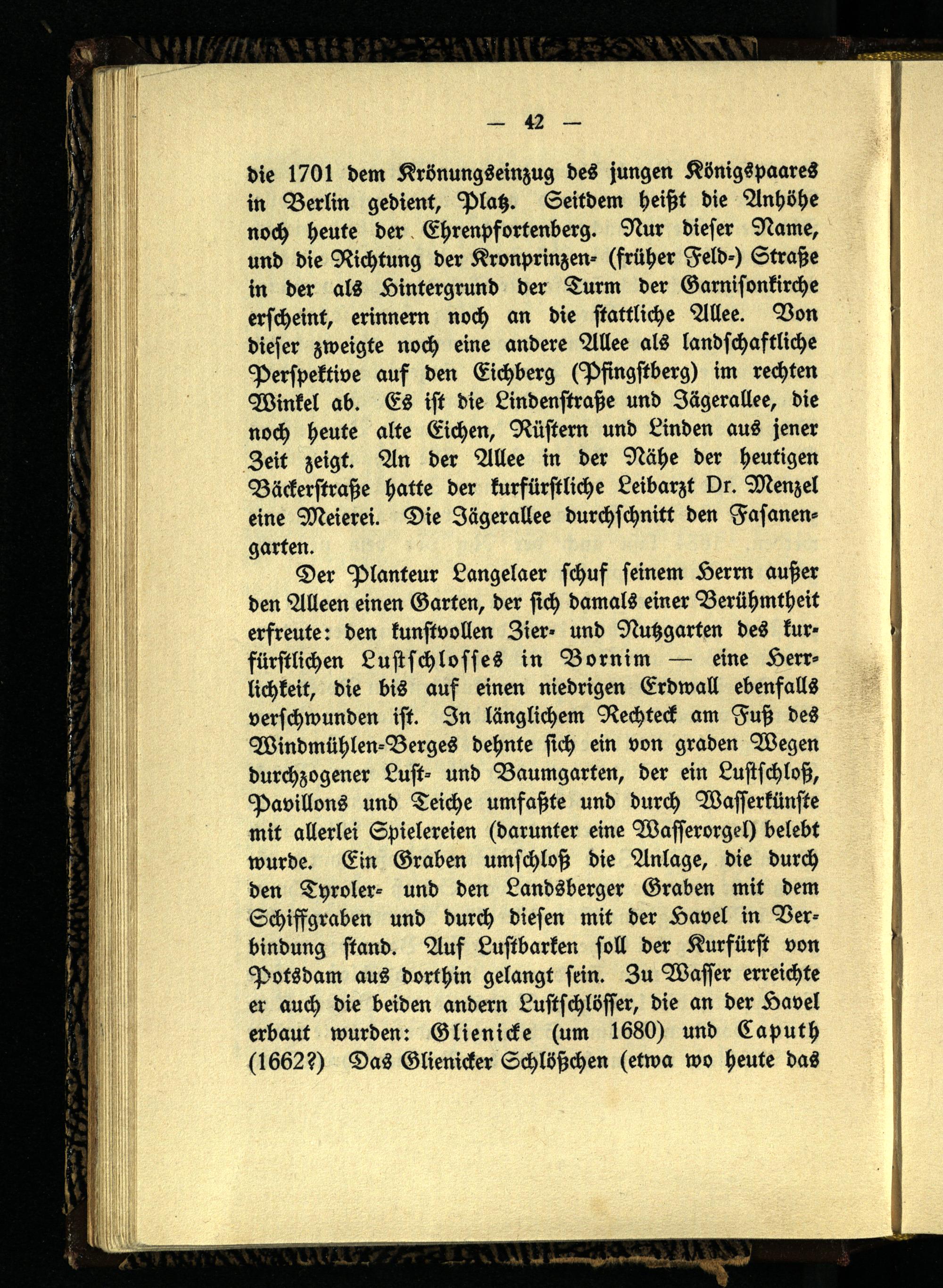 die 1701 dem Krönungseinzug des jungen Königspaares in Berlin gedient, Platz. Seitdem heißt die Anhöhe noch heute der Ehrenpfortenberg. Nur dieser Name, und die Richtung der Kronprinzen- (früher Feld-) Straße in der als Hintergrund der Turm der Garnisonkirche erscheint, erinnern noch an die stattliche Allee. Von dieser zweigte noch eine andere Allee als landschaftliche Perspektive auf den Eichberg (Pfingstberg) im rechten Winkel ab. Es ist die Lindenstraße und Jägerallee, die noch heute alte Eichen, Rüstern und Linden aus jener Zeit zeigt. An der Allee in der Nähe der heutigen Bäckerstraße hatte der kurfürstliche Leibarzt Dr. Menzel eine Meierei. Die Jägerallee durchschnitt den Fasanengatten.