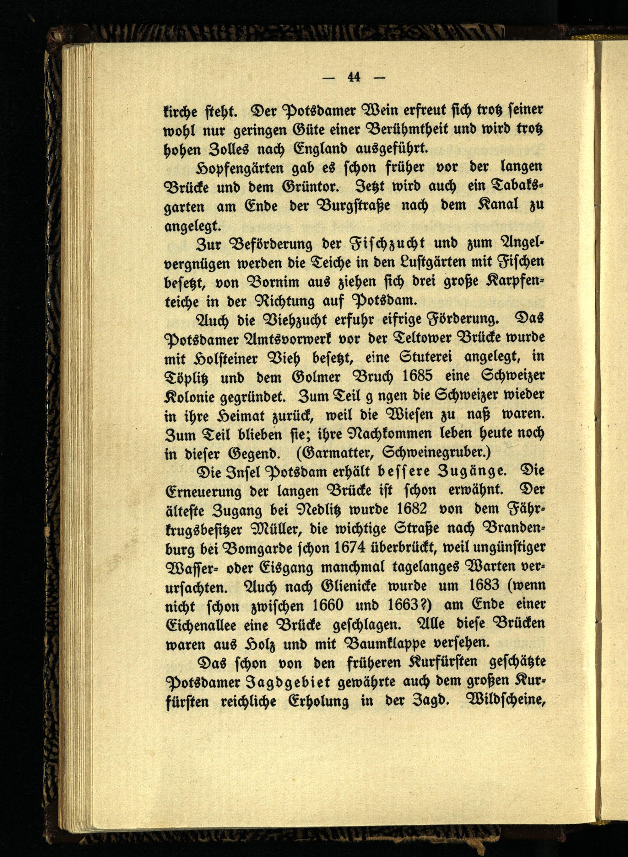 Auch die Viehzucht erfuhr eifrige Förderung. Das Potsdamer Amtsvorwerk vor der Teltower Brücke wurde mit Holsteiner Vieh besetzt, eine Stuterei angelegt, in Töplitz und dem Golmer Bruch 1685 eine Schweizer Kolonie gegründet. Zum Teil gingen die Schweizer wieder in ihre Heimat zurück, weil die Wiesen zu naß waren. Zum Teil blieben sie; ihre Nachkommen leben heute noch in dieser Gegend. (Garmatter, Schweinegruber.)