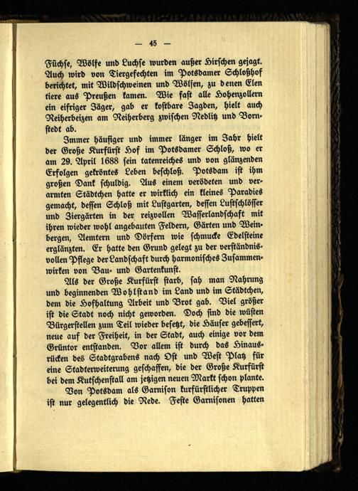 Immer häufiger und immer länger im Jahr hielt der Große Kurfürst Hof im Potsdamer Schloß, wo er am 29. April 1688 sein tatenreiches und von glänzenden Erfolgen gekröntes Leben beschloß. Potsdam ist ihm großen Dank schuldig. Aus einem verödeten und verarmten Städtchen hatte er wirklich ein kleines Paradies gemacht, dessen Schloß mit Lustgarten, dessen Lustschlösser und Ziergärten in der reizvollen Wasserlandschaft mit ihren wieder wohl angebauten Feldern, Gärten und Weinbergen, Aemtern und Dörfern wie schmucke Edelsteine erglänzten. Er hatte den Grund gelegt zu der verständnisvollen Pflege der Landschaft durch harmonisches Zusammenwirken von Bau- und Gartenkunst.
