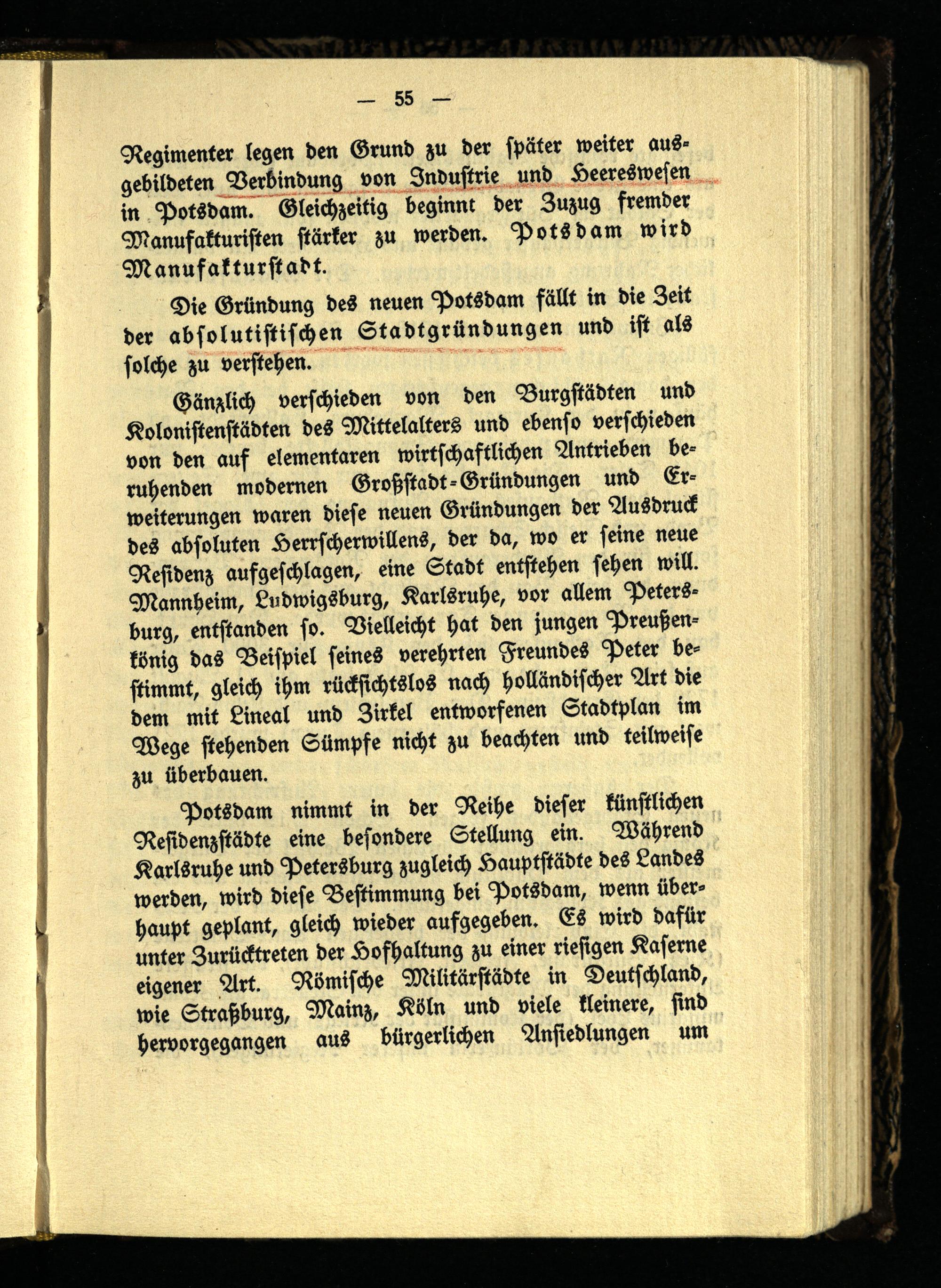 Potsdam nimmt in der Reihe dieser künstlichen Residenzstädte eine besondere Stellung ein. Während Karlsruhe und Petersburg zugleich Hauptstädte des Landes werden, wird diese Bestimmung bei Potsdam, wenn überhaupt geplant, gleich wieder aufgegeben. Es wird dafür unter Zurücktreten der Hofhaltung zu einer riesigen Kaserne eigener Art. Römische Militärstädte in Deutschland, wie Straßburg, Mainz, Köln und viele kleinere, sind hervorgegangen aus bürgerlichen Ansiedlungen um