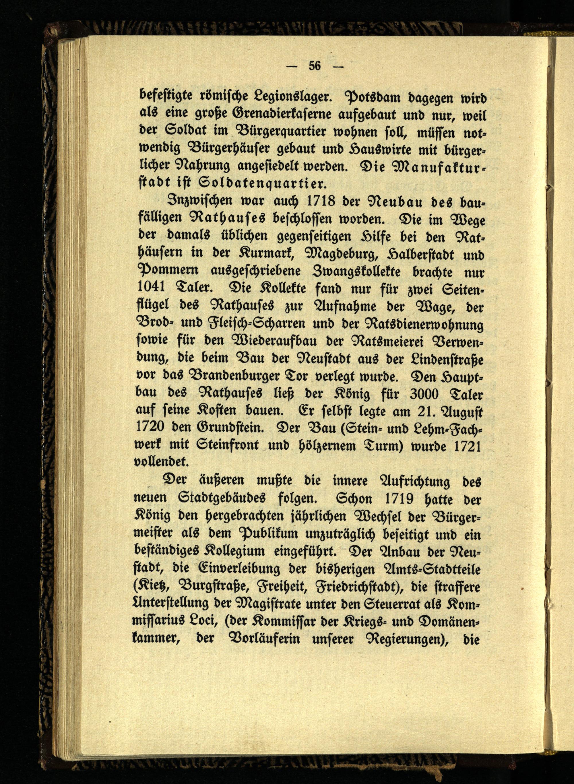 Der äußeren mußte die innere Aufrichtung des neuen Stadtgebäudes folgen. Schon 1719 hatte der König den hergebrachten jährlichen Wechsel der Bürgermeister als dem Publikum unzuträglich beseitigt und ein beständiges Kollegium eingeführt. Der Anbau der Neustadt, die Einverleibung der bisherigen Amts-Stadtteile (Kietz, Burgstraße, Freiheit, Friedrichstadt), die straffere Unterstellung der Magistrate unter den Steuerrat als Kom- missarius Loci, (der Kommissar der Kriegs- und Domänenkammer, der Vorläuferin unserer Regierungen), die