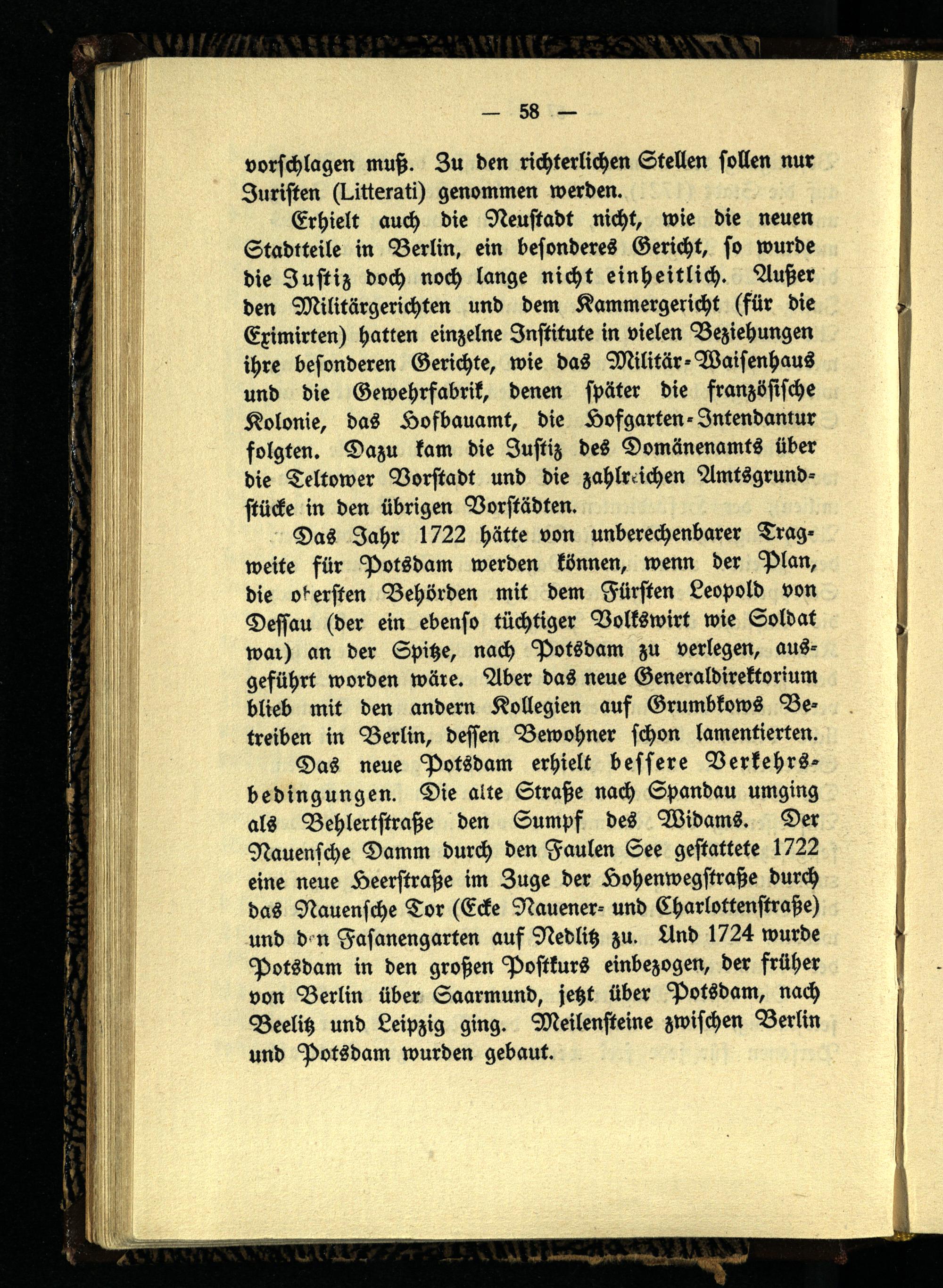 Das Jahr 1722 hätte von unberechenbarer Tragweite für Potsdam werden können, wenn der Plan, die obersten Behörden mit dem Fürsten Leopold von Dessau (der ein ebenso tüchtiger Volkswirt wie Soldat war) an der Spitze, nach Potsdam zu verlegen, aus- geführt worden wäre. Aber das neue Generaldirektorium blieb mit den andern Kollegien auf Grumbkows Betreiben in Berlin, dessen Bewohner schon lamentierten.