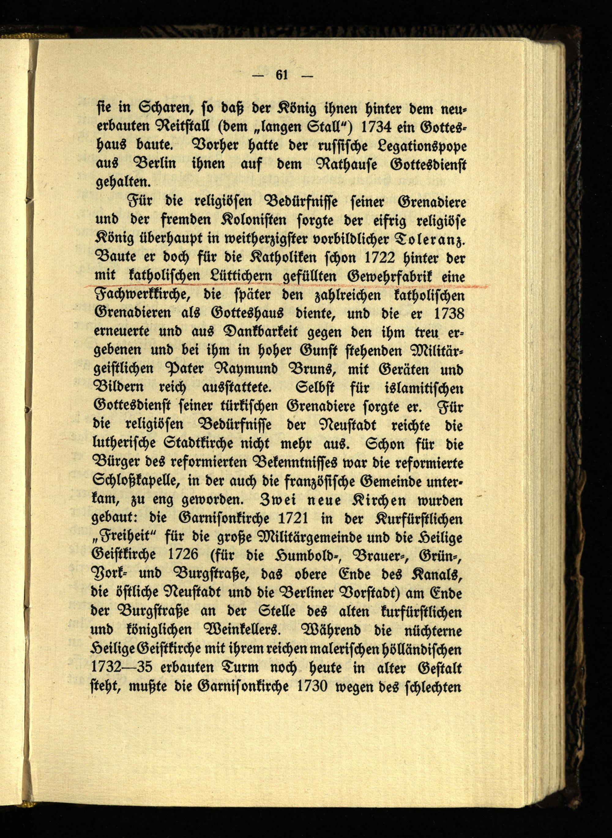 Für die religiösen Bedürfnisse seiner Grenadiere und der fremden Kolonisten sorgte der eifrig religiöse König überhaupt in weitherzigster vorbildlicher Toleranz. Baute er doch für die Katholiken schon 1722 hinter der mit katholischen Lüttichern gefüllten Gewehrfabrik eine Fachwerkkirche, die später den zahlreichen katholischen Grenadieren als Gotteshaus diente, und die er 1738 erneuerte und aus Dankbarkeit gegen den ihm treu ergebenen und bei ihm in hoher Gunst stehenden Militärgeistlichen Pater Raymund Bruns, mit Geräten und Bildern reich ausstattete. Selbst für islamitischen Gottesdienst seiner türkischen Grenadiere sorgte er. Für die religiösen Bedürfnisse der Neustadt reichte die lutherische Stadtkirche nicht mehr aus. Schon für die Bürger des reformierten Bekenntnisses war die reformierte Schloßkapelle, in der auch die französische Gemeinde unterkam, zu eng geworden. Zwei neue Kirchen wurden gebaut: die Garnisonkirche 1721 in der Kurfürstlichen „Freiheit" für die große Militärgemeinde und die Heilige Geistkirche 1726 (für die Humbold-, Brauer-, Grün-, Vork- und Burgstraße, das obere Ende des Kanals, die östliche Neustadt und die Berliner Vorstadt) am Ende der Burgstraße an der Stelle des alten kurfürstlichen und königlichen Weinkellers. Während die nüchterne Heilige Geistkirche mit ihrem reichen malerischen hölländischen 1732—35 erbauten Turm noch heute in alter Gestalt steht, mußte die Garnisonkirche 1730 wegen des schlechten