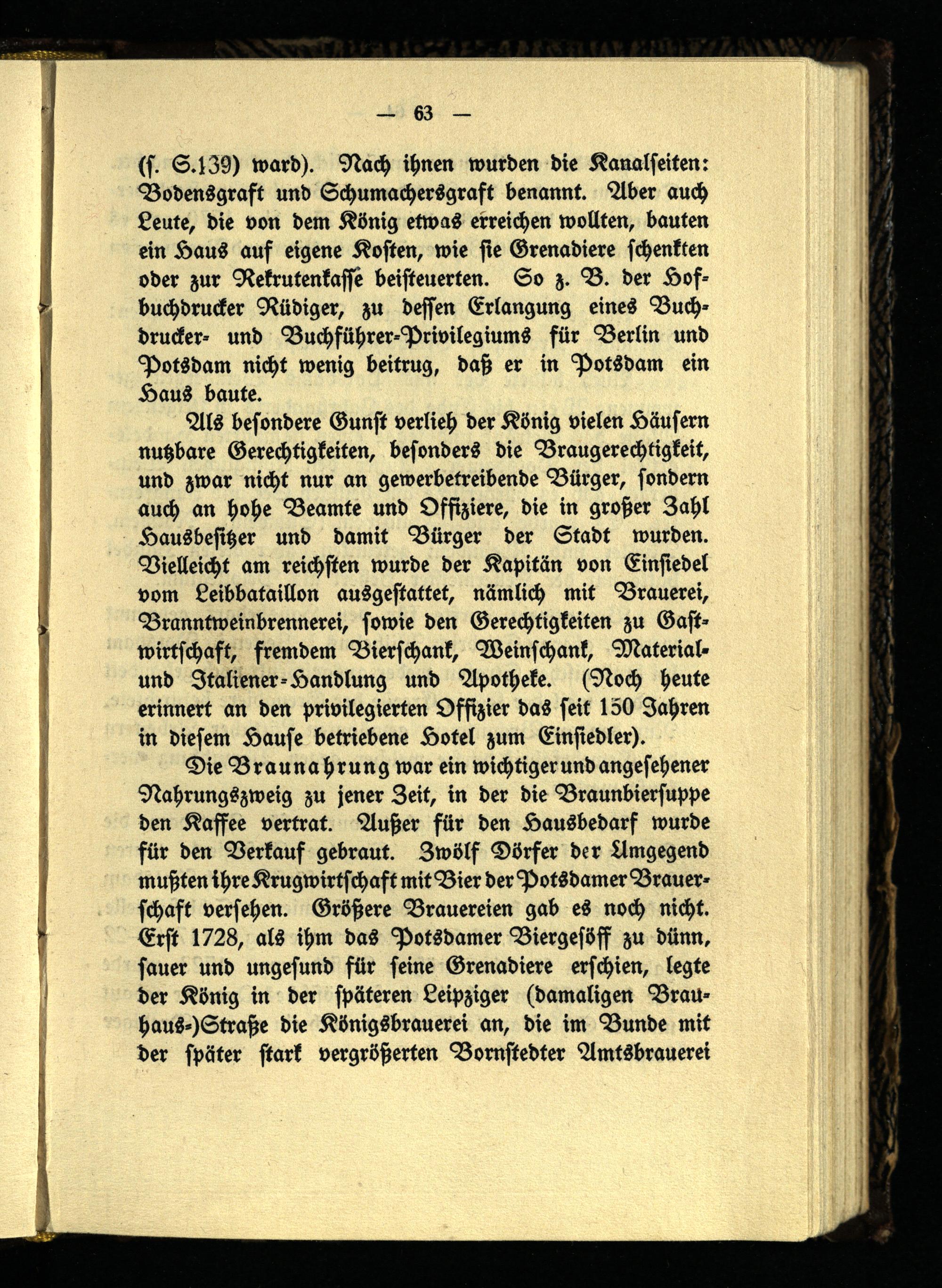 (s. S. 139) ward). Nach ihnen wurden die Kanalseiten: Bodensgraft und Schumachersgrft benannt. Aber auch Leute, die von dem König etwas erreichen wollten, bauten ein Haus auf eigene Kosten, wie sie Grenadiere schenkten oder zur Rekrutenkasse beisteuerten. So z. B. der Hof- buchdrucker Rüdiger, zu dessen Erlangung eines Buchdrucker- und Buchführer-Privilegiums für Berlin und Potsdam nicht wenig beitrug, daß er in Potsdam ein Haus baute.