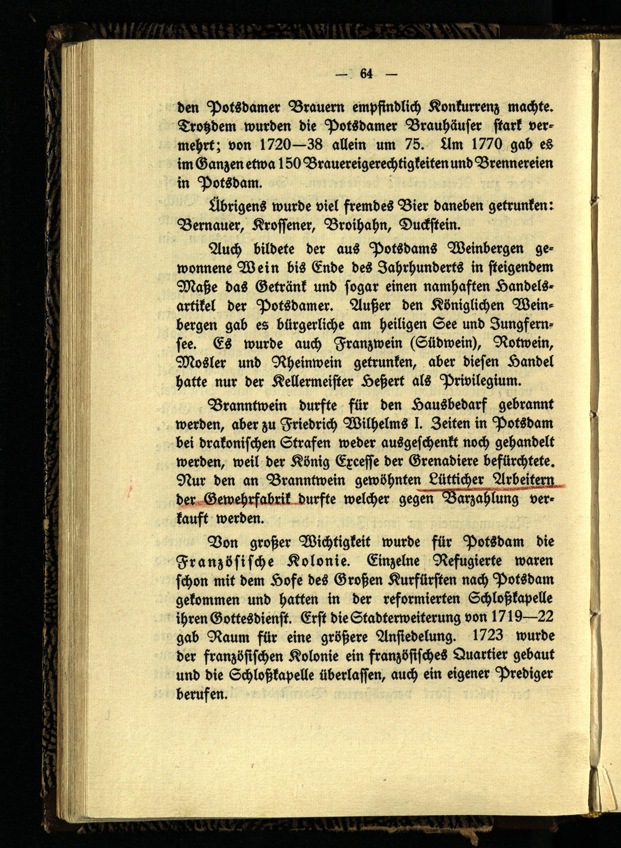 den Potsdamer Brauern empfindlich Konkurrenz machte. Trotzdem wurden die Potsdamer Brauhäuser stark vermehrt; von 1720—38 allein um 75. Um 1770 gab es im Ganzen etwa 150 Brauereigerechtigkeiten und Brennereien in Potsdam.