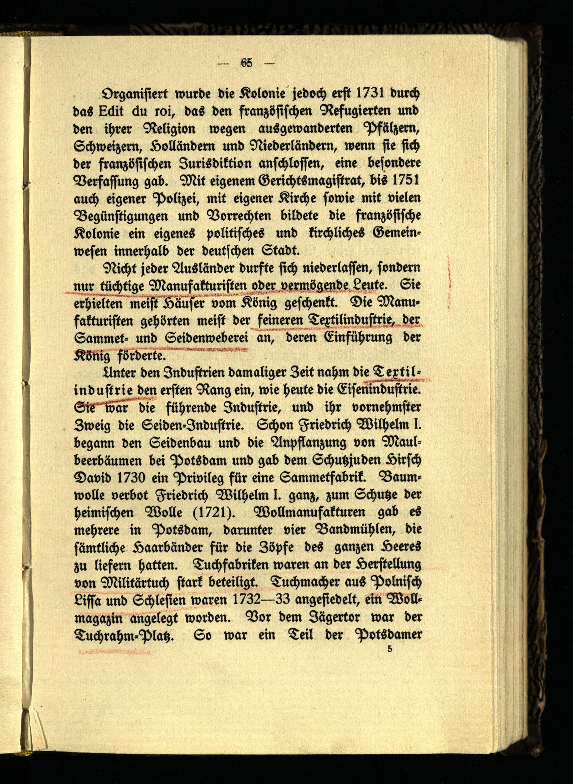 Nicht jeder Ausländer durfte sich niederlassen, sondern nur tüchtige Manufakturisten oder vermögende Leute. Sie erhielten meist Häuser vom König geschenkt. Die Manufakturisten gehörten meist der feineren Textilindustrie, der Sammet- und Seidenweberei an, deren Einführung der König förderte.