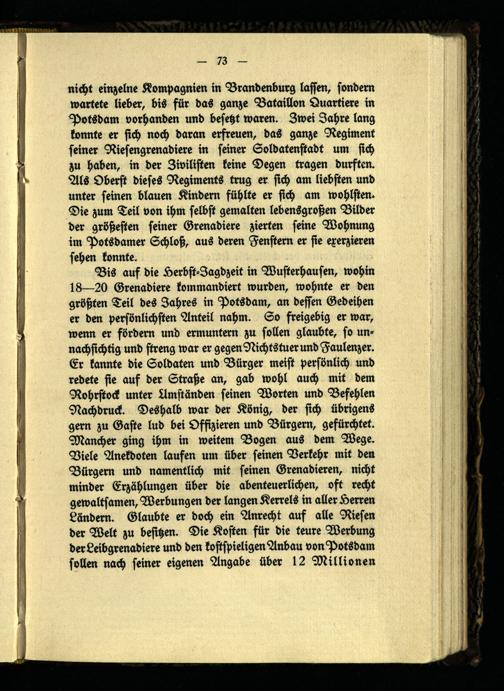 nicht einzelne Kompagnien in Brandenburg lassen, sondern wartete lieber, bis für das ganze Bataillon Quartiere in Potsdam vorhanden und besetzt waren. Zwei Jahre lang konnte er sich noch daran erfreuen, das ganze Regiment seiner Riesengrenadiere in seiner Soldatenstadt um sich zu haben, in der Zivilisten keine Degen tragen durften. Als Oberst dieses Regiments trug er sich am liebsten und unter seinen blauen Kindern fühlte er sich am wohlsten. Die zum Teil von ihm selbst gemalten lebensgroßen Bilder der größesten seiner Grenadiere zierten seine Wohnung im Potsdamer Schloß, aus deren Fenstern er sie exerzieren sehen konnte.