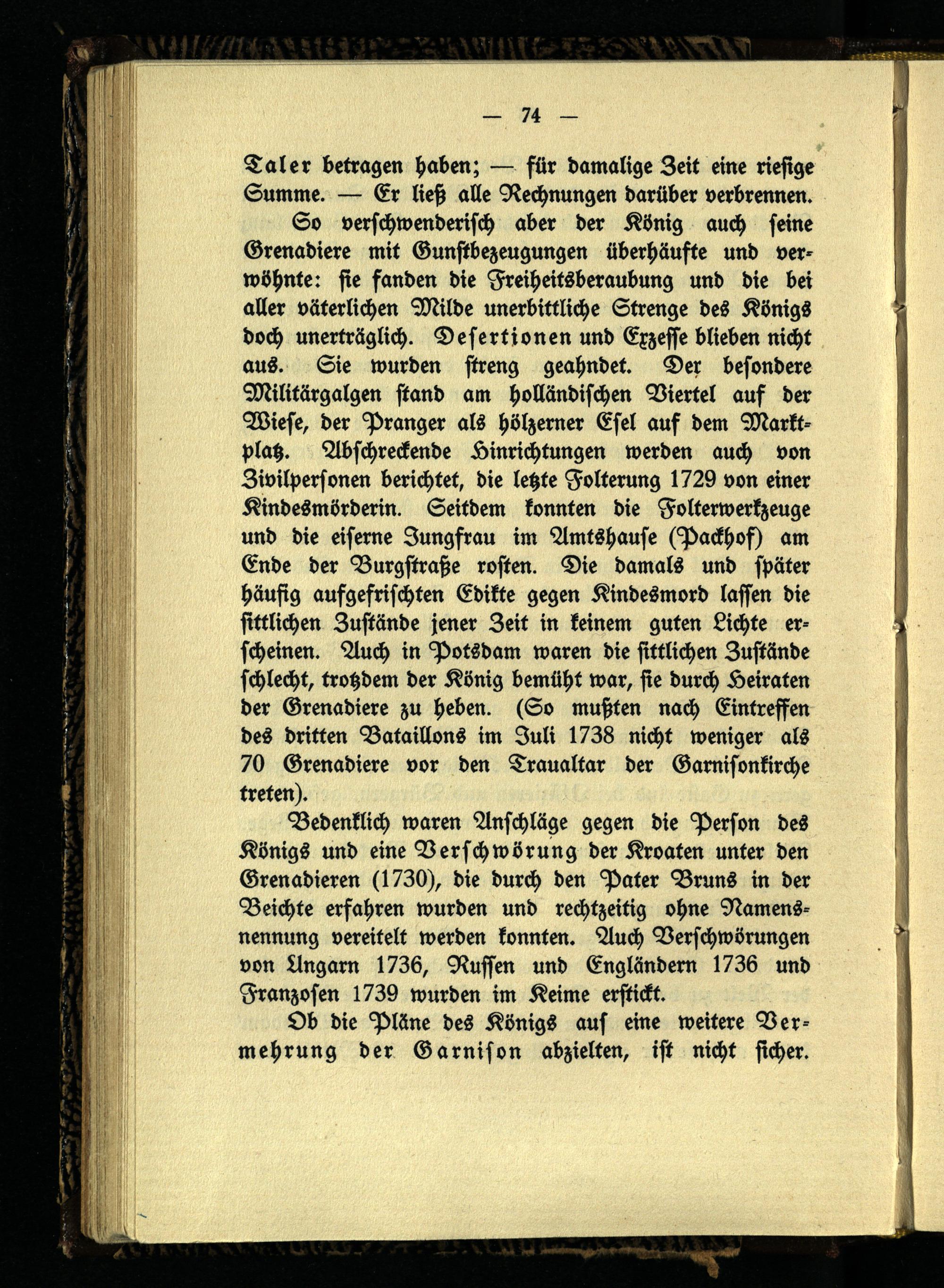 So verschwenderisch aber der König auch seine Grenadiere mit Gunstbezeugungen überhäufte und verwöhnte: sie fanden die Freiheitsberaubung und die bei aller väterlichen Milde unerbittliche Strenge des Königs doch unerträglich. Desertionen und Exzesse blieben nicht aus. Sie wurden streng geahndet. Der besondere Militärgalgen stand am holländischen Viertel auf der Wiese, der Pranger als hölzerner Esel auf dem Marktplatz. Abschreckende Hinrichtungen werden auch von Zivilpersonen berichtet, die letzte Folterung 1729 von einer Kindesmörderin. Seitdem konnten die Folterwerkzeuge und die eiserne Jungfrau im Amtshause (Packhof) am Ende der Burgstraße rosten. Die damals und später häufig aufgefrischten Edikte gegen Kindesmord lassen die sittlichen Zustände jener Zeit in keinem guten Lichte erscheinen. Auch in Potsdam waren die sittlichen Zustände schlecht, trotzdem der König bemüht war, sie durch Heiraten der Grenadiere zu heben. (So mußten nach Eintreffen des dritten Bataillons im Juli 1738 nicht weniger als 70 Grenadiere vor den Traualtar der Garnisonkirche treten).