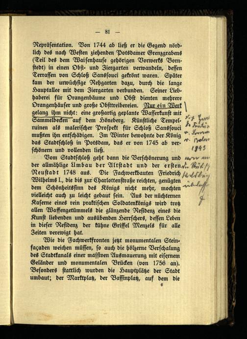 Repräsentation. Von 1744 ab ließ er die Gegend nördlich des nach Westen ziehenden Potsdamer Grenzgrabens (Teil des dem Waisenhause gehörigen Vorwerks Born- stedt) in einen Obst- und Ziergarten verwandeln, dessen Terrassen von Schloß Sanssouci gekrönt waren. Später kam der urwüchsige Rehgarten dazu, durch die lange Hauptallee mit dem Ziergarten verbunden. Seiner Liebhaberei für Orangenbäume und Obst dienten mehrere Orangenhäuser und große Obsttreibereien. Nur ein Wer k gela ng ihm nicht: eine großartig geplante Wasserkunst mit Sammelbecken auf dem Löneberg. Künstliche Tempelminen als malerischer Prospekt für Schloß Sanssouci mußten ihn entschädigen. Im Winter bewohnte der König das Stadtschloß in Potsdam, das er von 1745 ab verschönern und vollenden ließ.